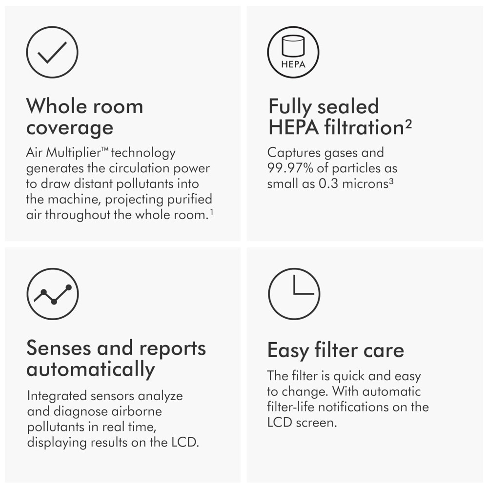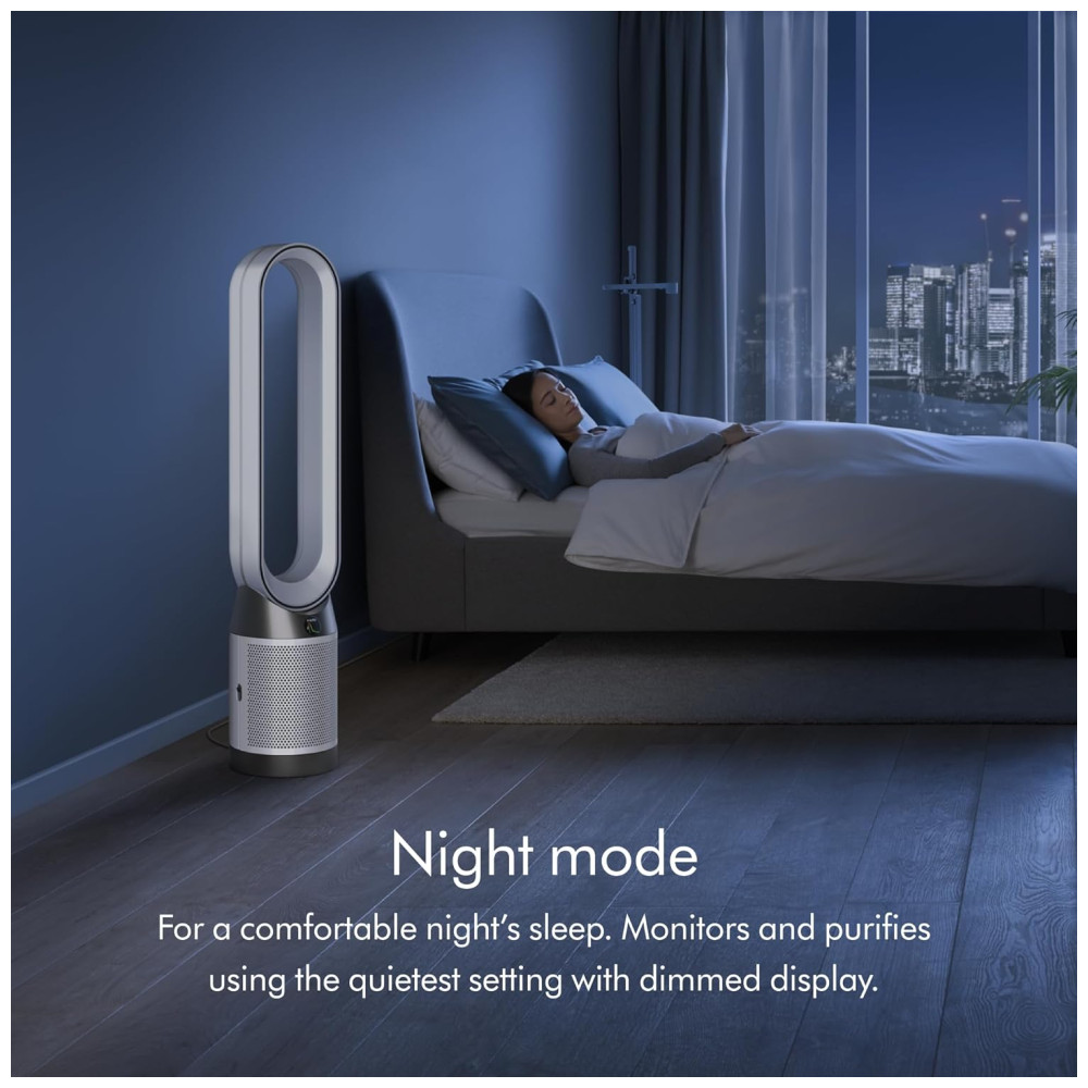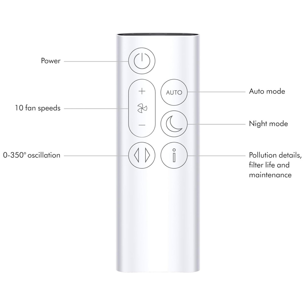 O Ventilador Purificador Dyson Purifier Cool Gen1 TP10 em branco é capaz de detectar, capturar e reter automaticamente poluentes para purificar todo o ambiente, removendo 99,97% de partículas tão pequenas como 0,3 mícrons. Testado de acordo com os padrões internos da Dyson para projeção de ar em todo o ambiente DTM108 e cobertura de purificação TM003711. Desafio de partículas com óleo DEHS especificado em EN1822 dentro de uma câmara especificada em ASTM F3150. Testado no Modo Máximo para eficiência de toda a máquina acima de 99,95%. A tecnologia Air Multiplier circula o ar purificado por todo o ambiente. O controle remoto curvo e magnetizado se armazena discretamente na máquina. Não possui compatibilidade com aplicativos. Oscila até 350 graus. Programado para desligar após intervalos pré-definidos de 1, 2, 4 e 8 horas. Totalmente selado até o padrão HEPA, mantendo o que entra, dentro. O modo noturno monitora e purifica utilizando as configurações mais silenciosas, com a tela.