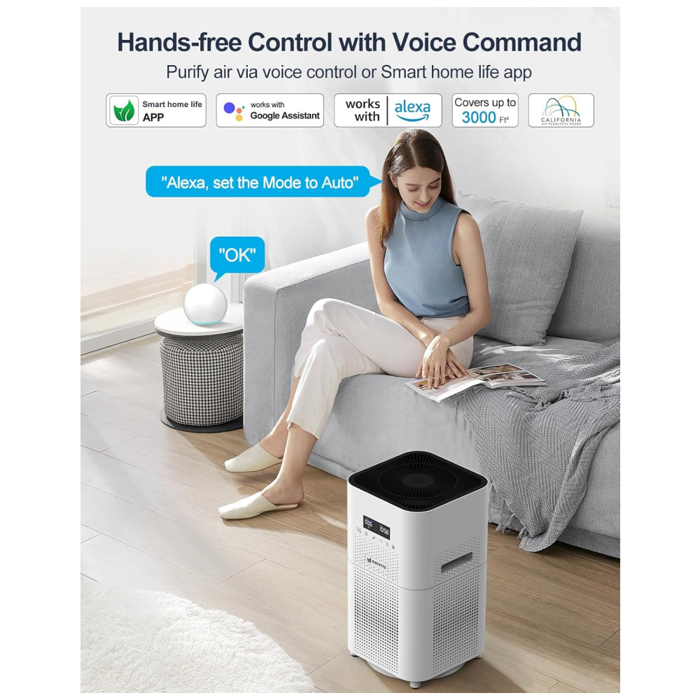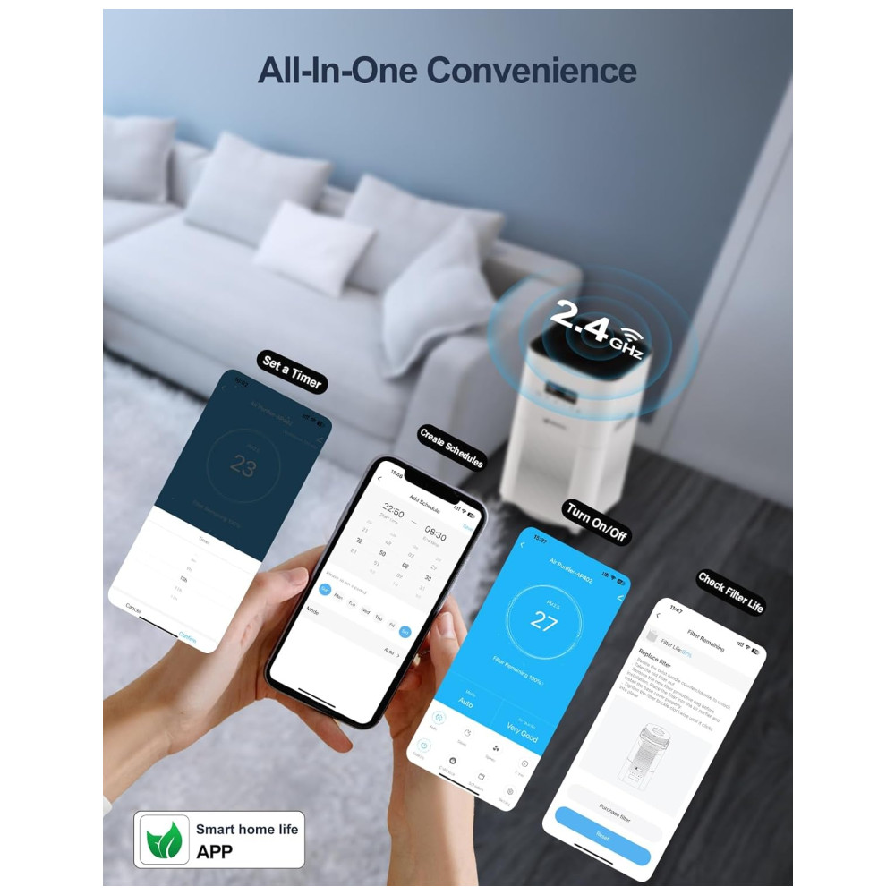 Com tecnologia de entrada de ar 360 e uma área de cobertura de 300 pés quadrados, este purificador de ar inteligente é capaz de purificar completamente uma sala grande de até 911,85 metros quadrados uma vez por hora. É adequado para uso em toda a casa ou em qualquer espaço fechado, como salas de estar, cozinhas, quartos, escritórios, restaurantes, hotéis e laboratórios.