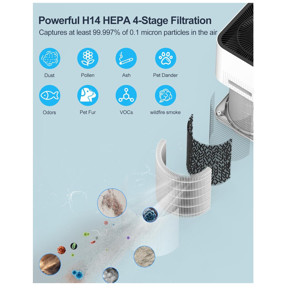 Equipado com um sistema de filtragem de 4 estágios, incluindo um filtro HEPA verdadeiro, pré filtro e filtro de carvão ativado de alta eficiência, este purificador de ar é capaz de capturar 99,97 das partículas transportadas pelo ar com tamanho de 0,3 mícron. Ele é especialmente eficaz na remoção de poeira, fumaça, pólen, odor, pêlos de animais e cheiros de cozinha ou casa multipet. Além disso, ajuda a combater garganta seca, congestão noturna, alergias e asma.