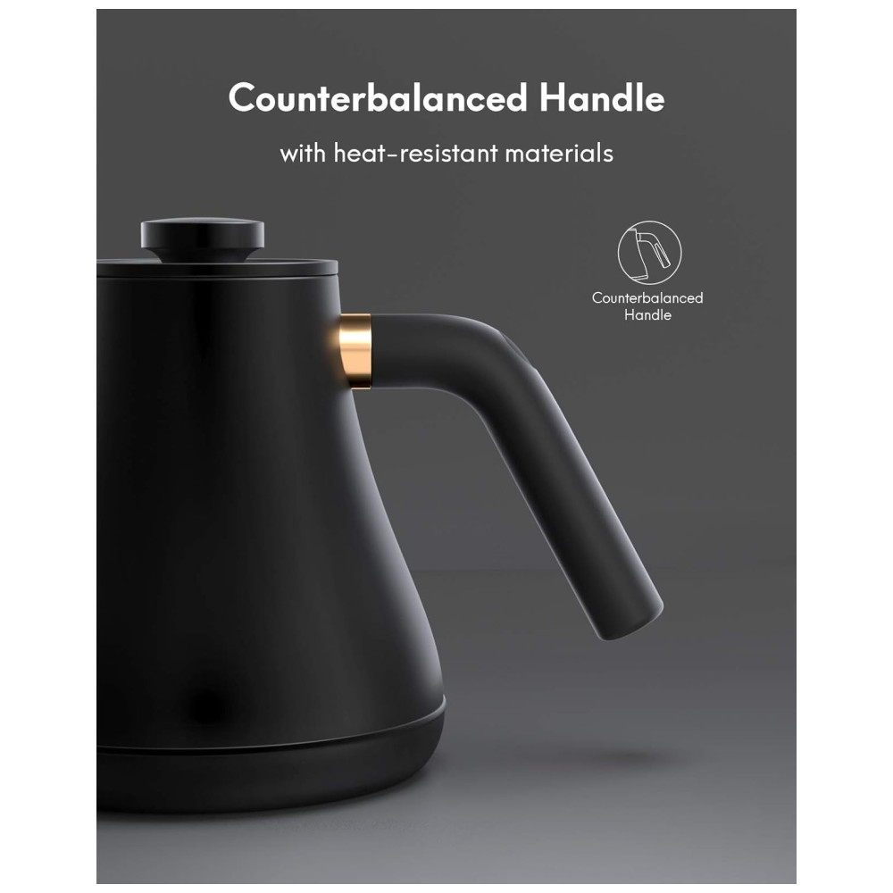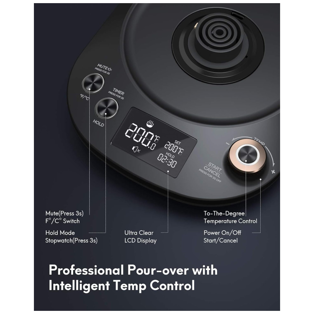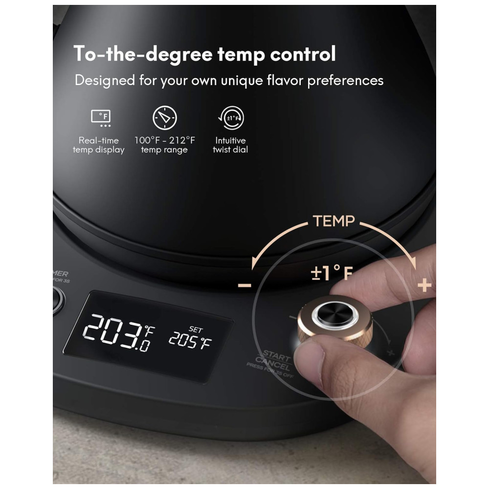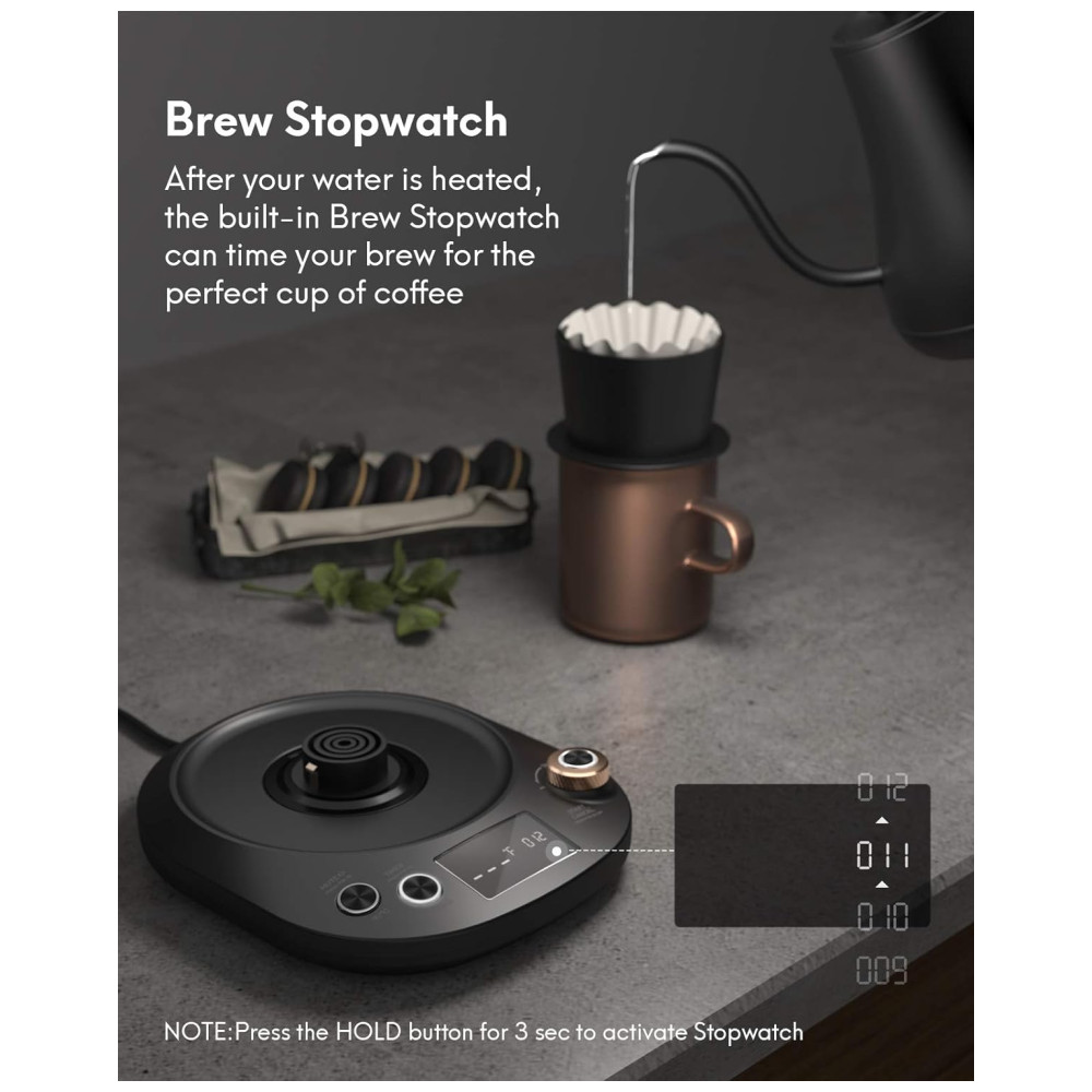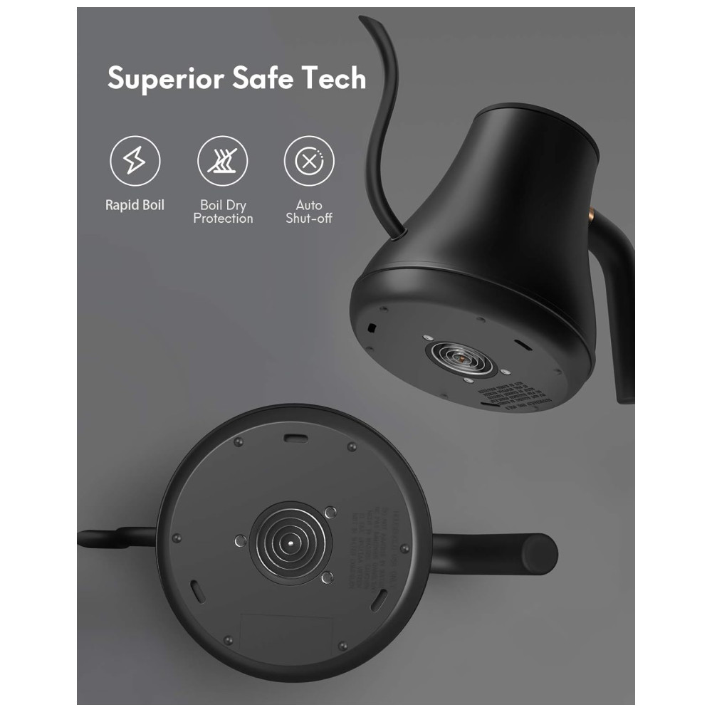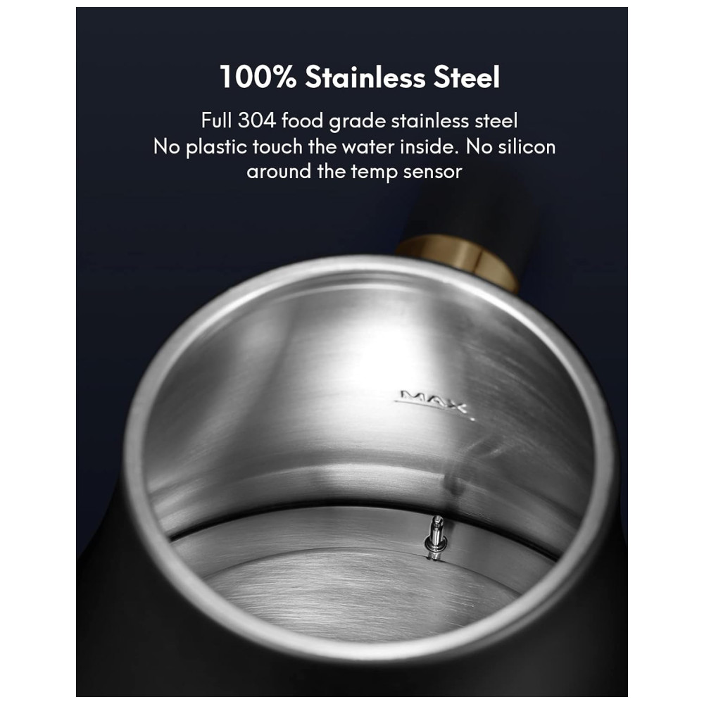 Pure Taste Safe Tech A chaleira interna é feita de aço inoxidável 304 de grau alimentício. Em comparação com outras chaleiras de temperatura variável, não há silicone ou plástico além do sensor de temperatura. Com sensor de temperatura NTC, a chaleira desligará automaticamente assim que a água atingir a temperatura desejada.