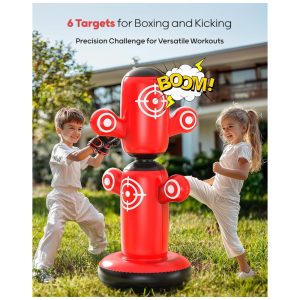 Design Rotativo 360°: Estrutura única com partes superior e inferior segmentadas que aprimoram a interatividade e a diversão durante o uso, permitindo às crianças praticar esquivas enquanto treinam boxe.