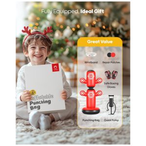 Acessórios Completos: Inclui luvas e bomba de ar de enchimento rápido para uso prático. Um presente ideal para as crianças gastarem energia, se distanciarem das telas, aliviarem o estresse e melhorarem a coordenação, tudo que você precisa para criar momentos felizes com esta bolsa de boxe.