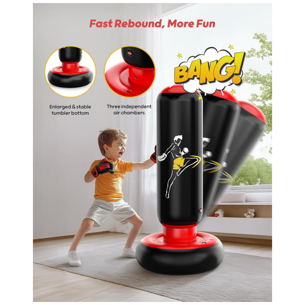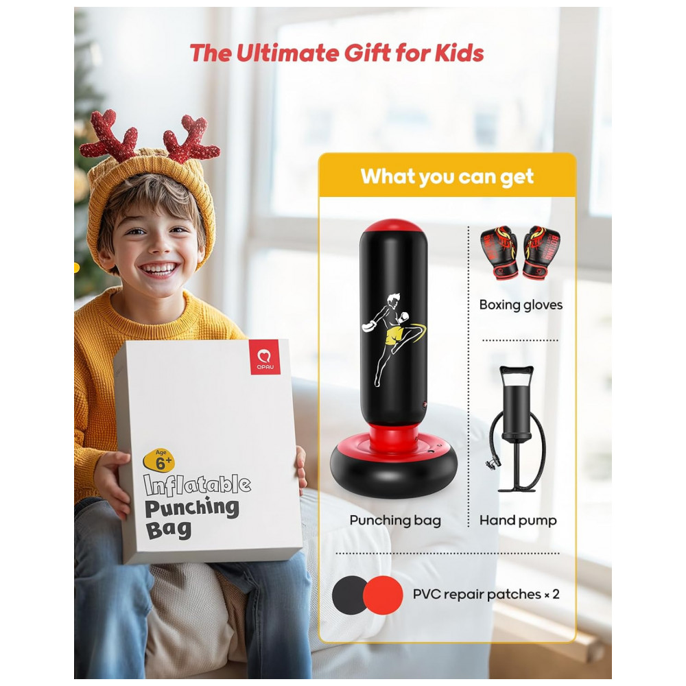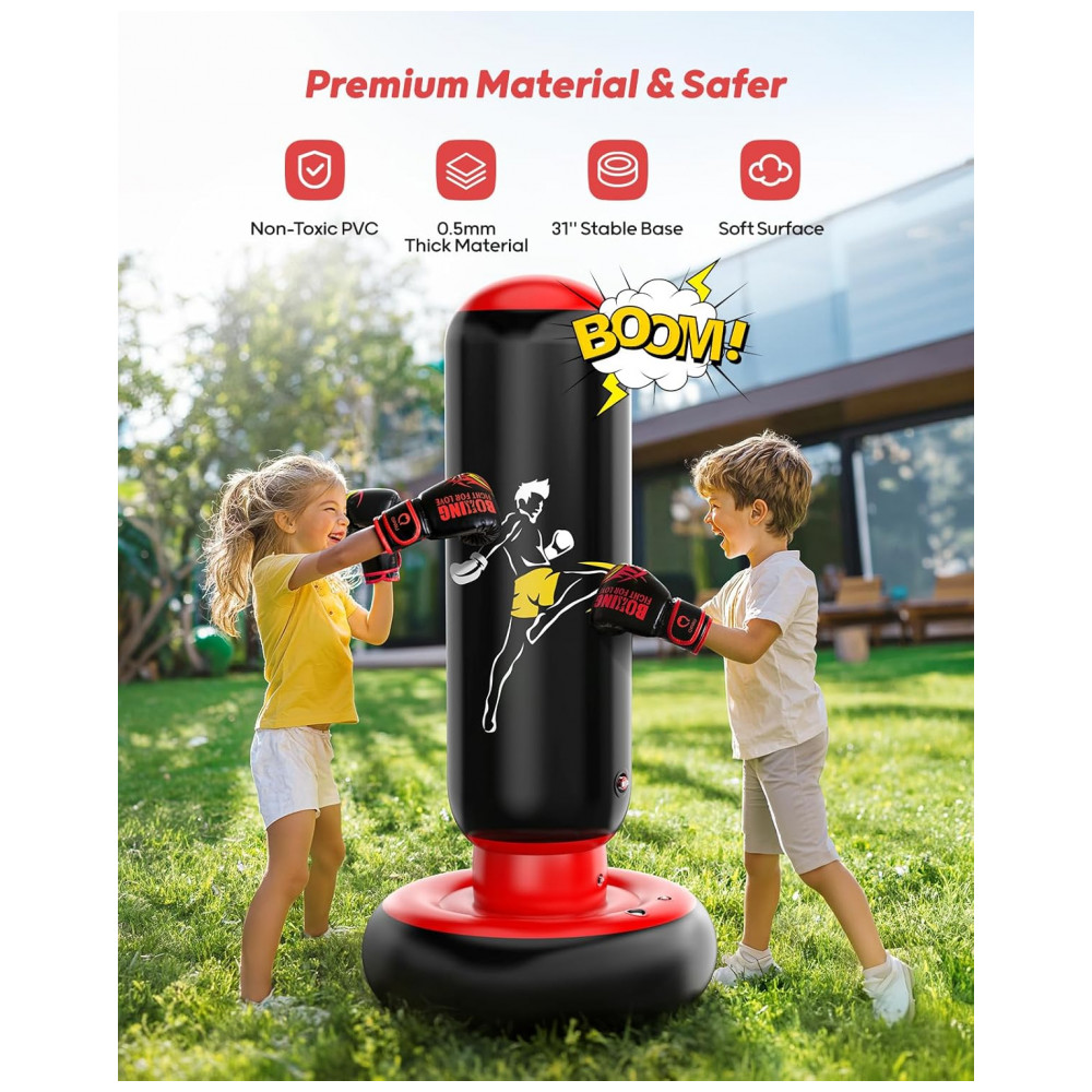 QPAU Saco de Pancadas Inflável Infantil 168 cm com Luvas de Boxe – Preto e Vermelho