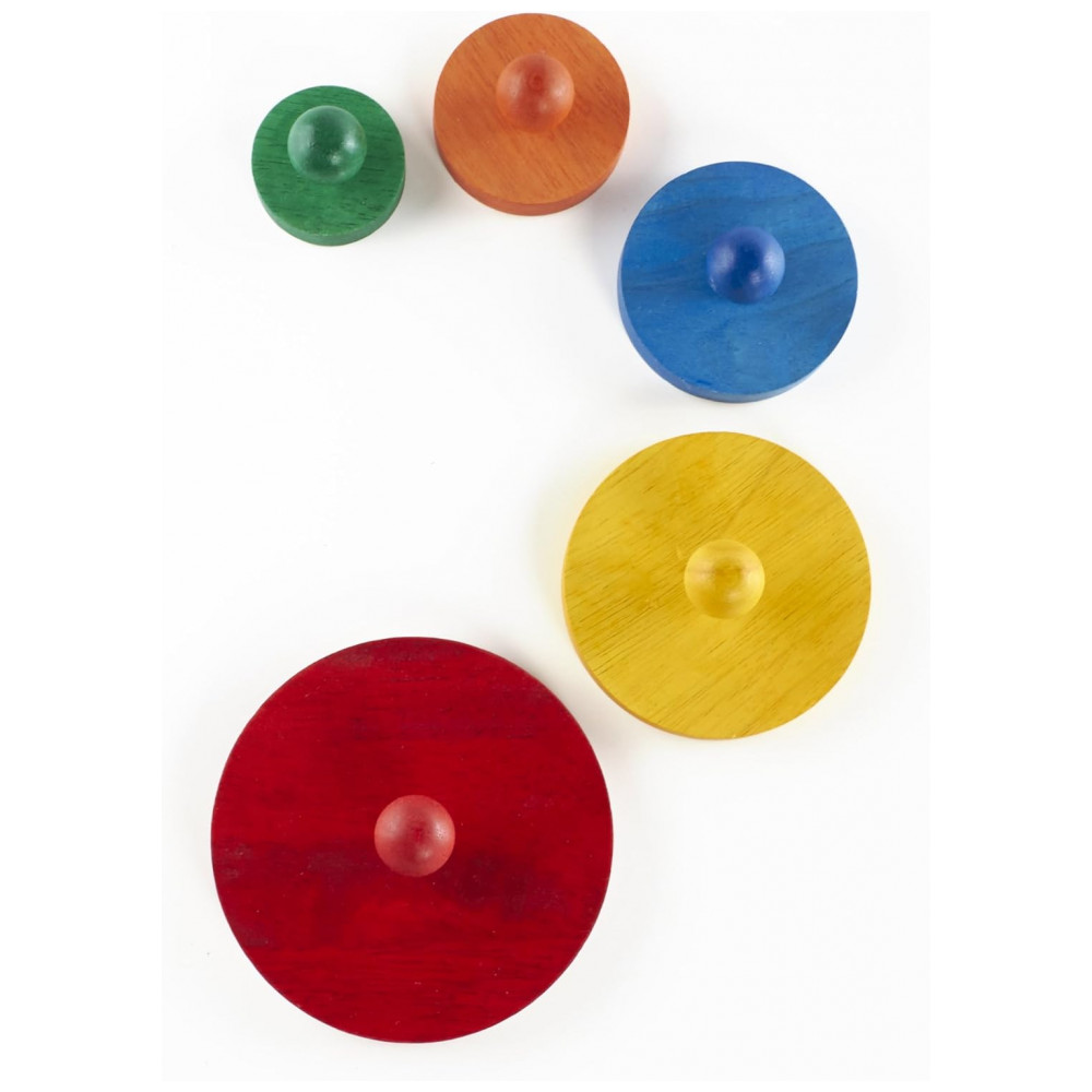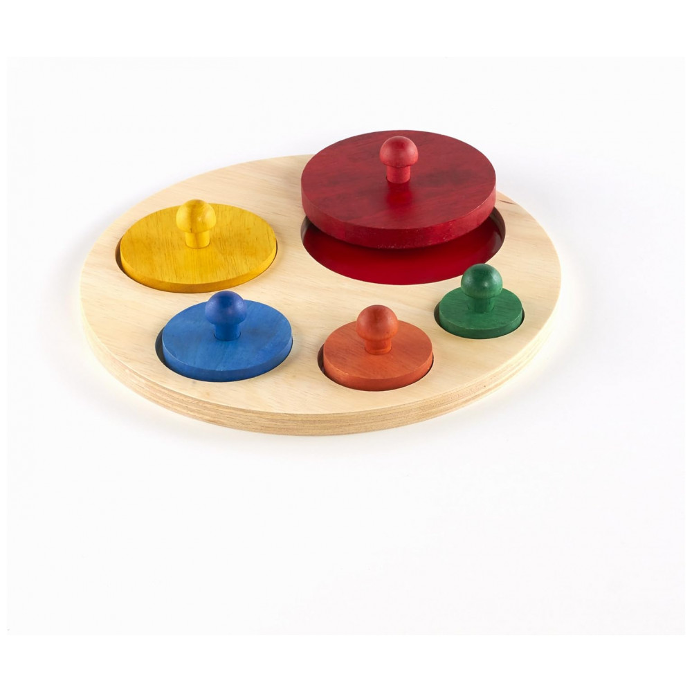 Quebra-cabeça infantil de encaixe em madeira com círculos graduados, desenvolvido para bebês e crianças pequenas a partir de cerca de 1 ano. O brinquedo apresenta cinco círculos de tamanhos diferentes que se encaixam em recortes correspondentes na base, com pinos grandes e coloridos que facilitam o movimento de pinça e a manipulação pelas mãos pequenas.