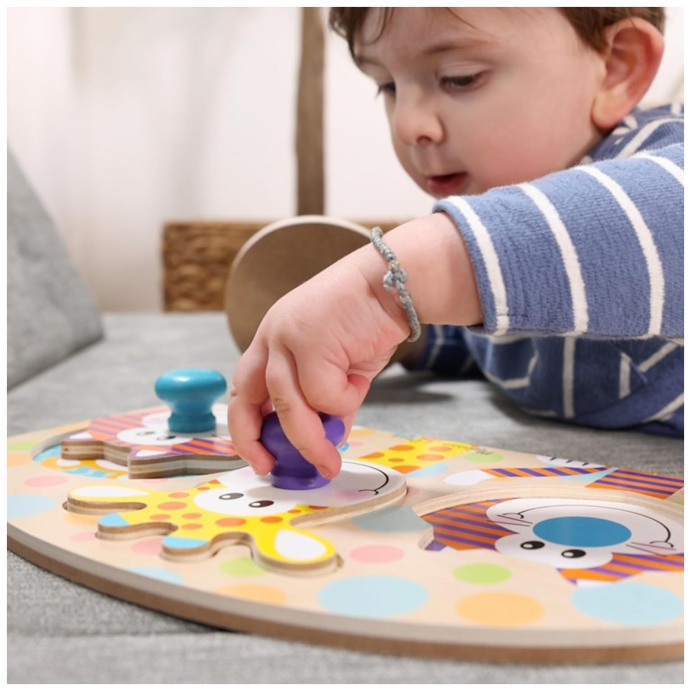 Este quebra cabeça de botão enorme com tema de animal de safári de madeira de 3 peças é perfeito para bebês e crianças pequenas. Com seus narizes de botão de madeira fáceis de agarrar, o tigre, a girafa e o leão sorridentes vão encantar as crianças e ajudá las a desenvolver habilidades motoras finas enquanto descobrem cores e padrões.