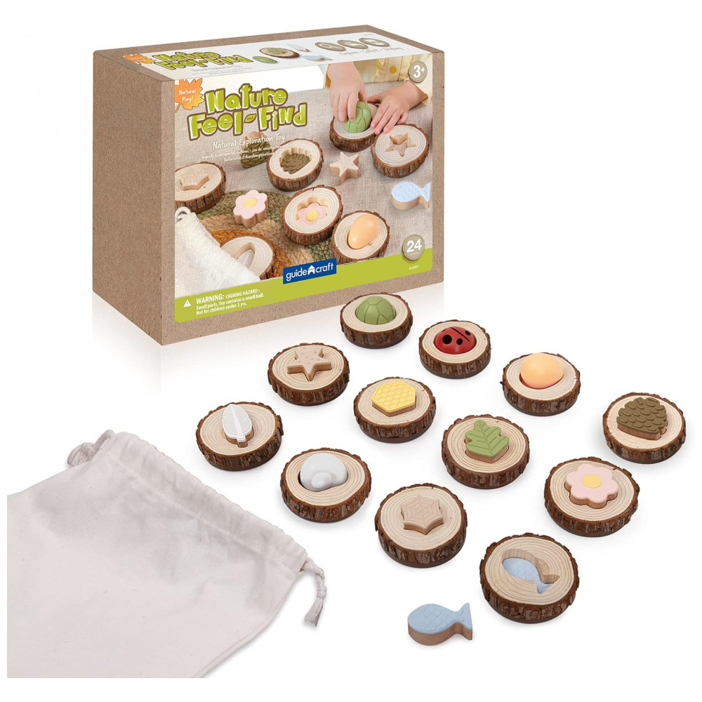 O Guidecraft Nature Feel and Find – 24 peças é um jogo de pareamento tátil e visual inspirado em elementos da natureza, indicado para crianças a partir de 3 anos. As peças trazem relevos e formas que remetem a flores, teias de aranha, joaninhas, cascos de tartaruga, ovos, pinhas e outros elementos naturais, favorecendo reconhecimento e associação durante o manuseio.