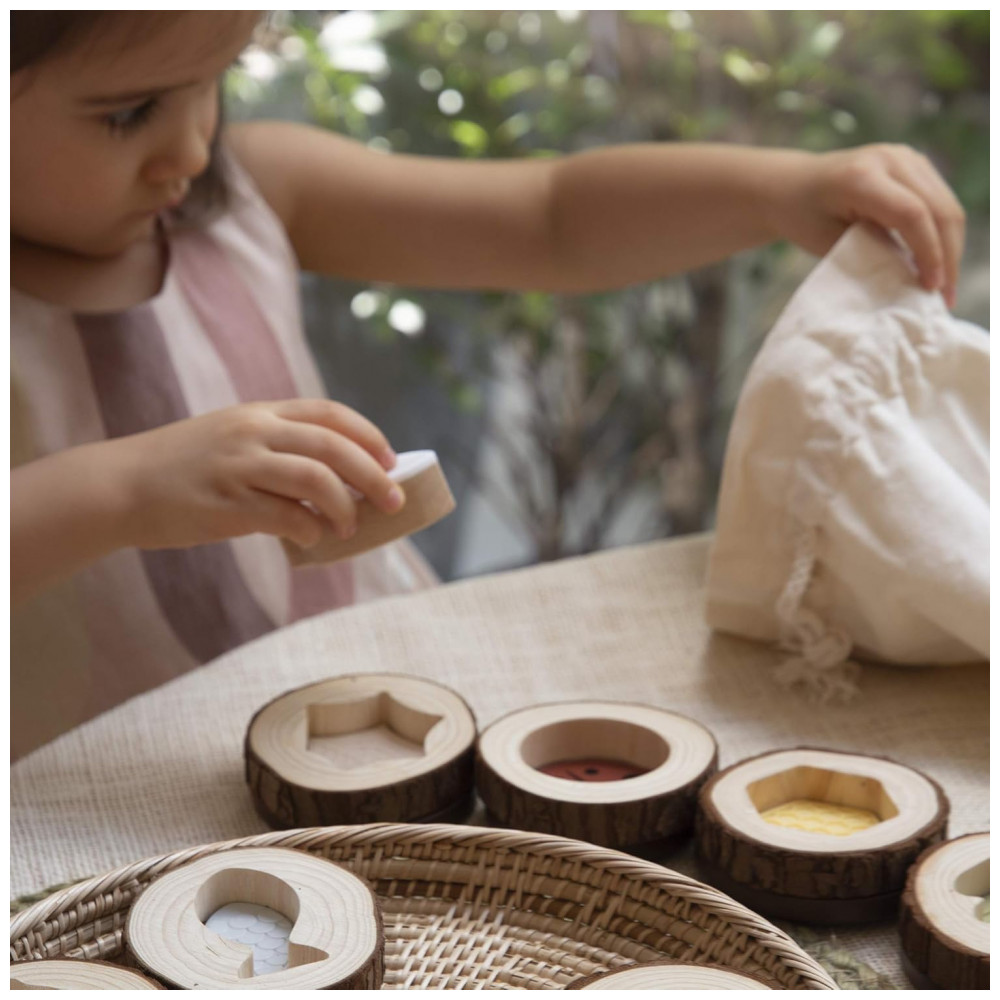 As fichas em formato de “cookies” de madeira são sobredimensionadas e apresentam texturas gravadas, permitindo que a criança explore os relevos com as mãos e relacione cada peça ao contorno correspondente. Ao longo do uso, a superfície em madeira tende a desgastar de forma visível, introduzindo a observação de mudanças naturais com o tempo. O conjunto acompanha saco em tecido para armazenamento e uso em atividades de exploração tátil às cegas.