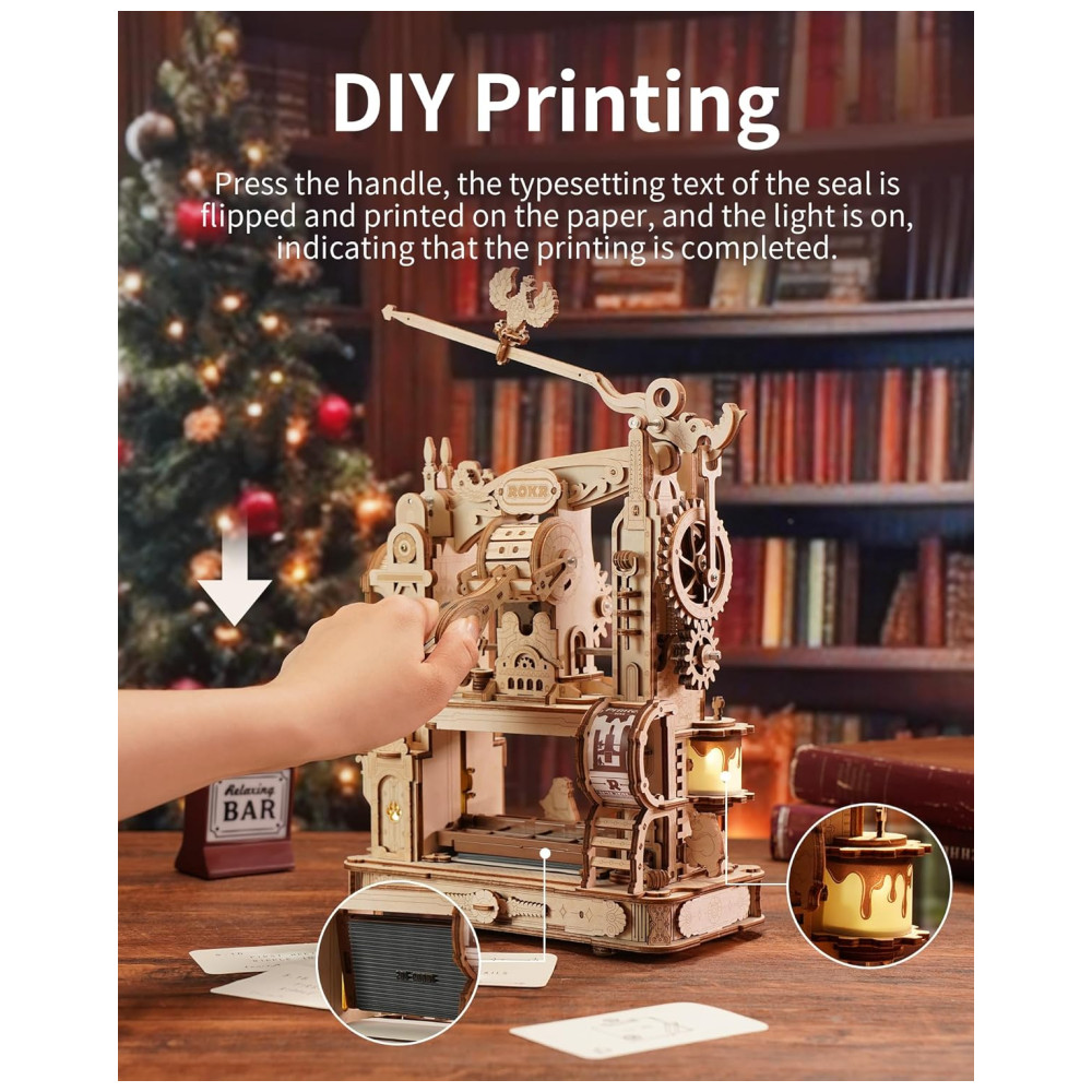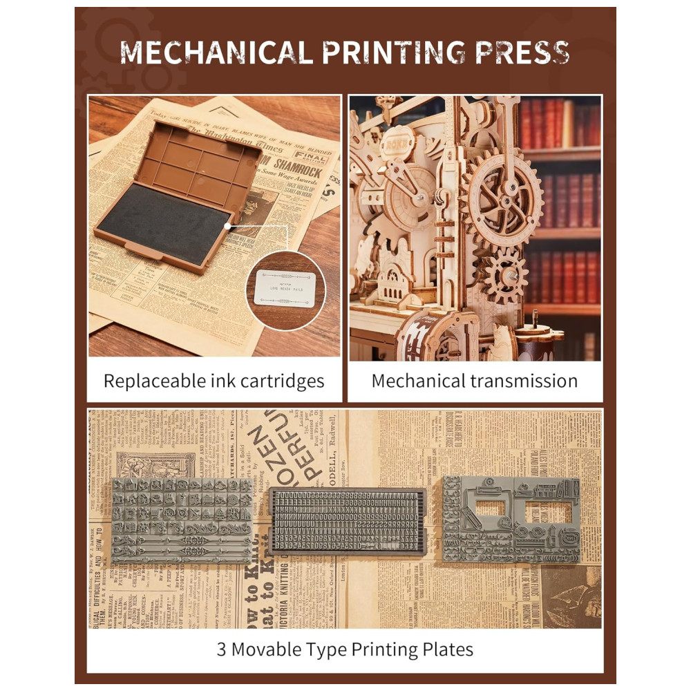 Este quebra cabeça 3D contém 303 peças, um manual de instruções ilustrado, lista de peças, chave de fenda, mola e carimbos de borracha. Os carimbos incluem números, kaomoji e várias pinturas de desenhos animados, permitindo uma ampla variedade de escolhas. A caixa de tinta à base de água e as 20 folhas de papel de escrita de 8 cm x 5 cm podem ser armazenadas na gaveta inferior da máquina. A montagem do quebra cabeça requer 5 horas de paciência, mas o resultado é uma impressora clássica adequada para coleção.