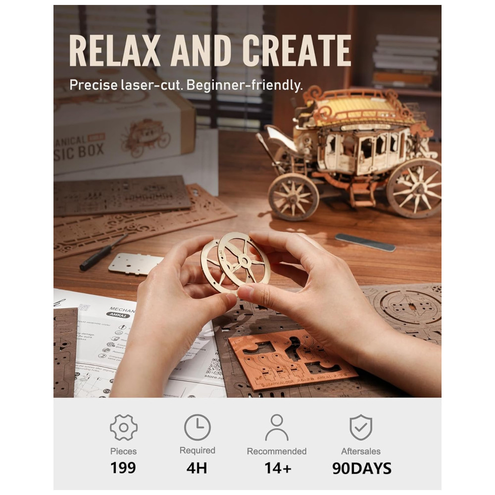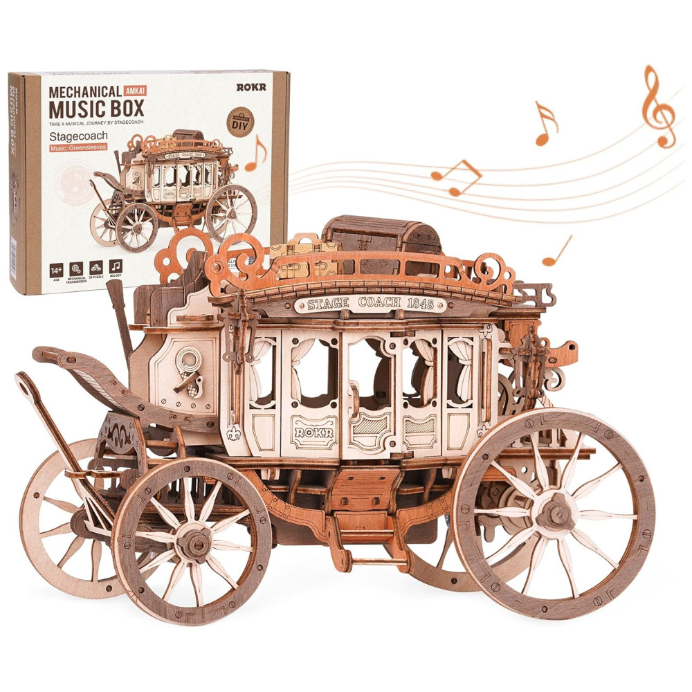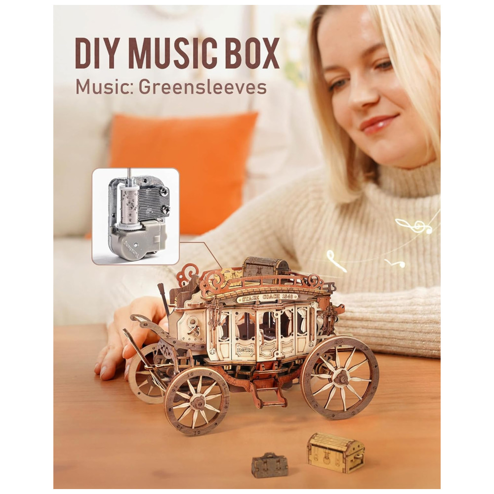 Quebra Cabeças 3D em Madeira para Adultos Tema Caixa de Música Carruagem Retrô do Velho Oeste com 199 Peças ROKR Marrom