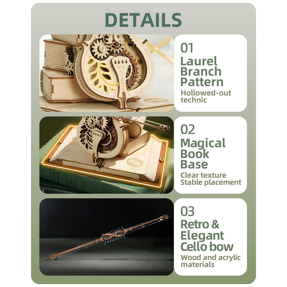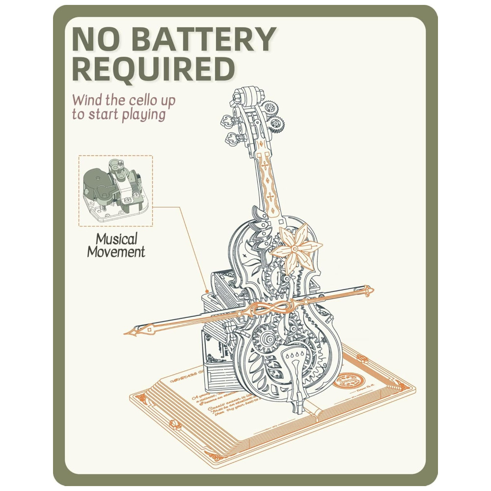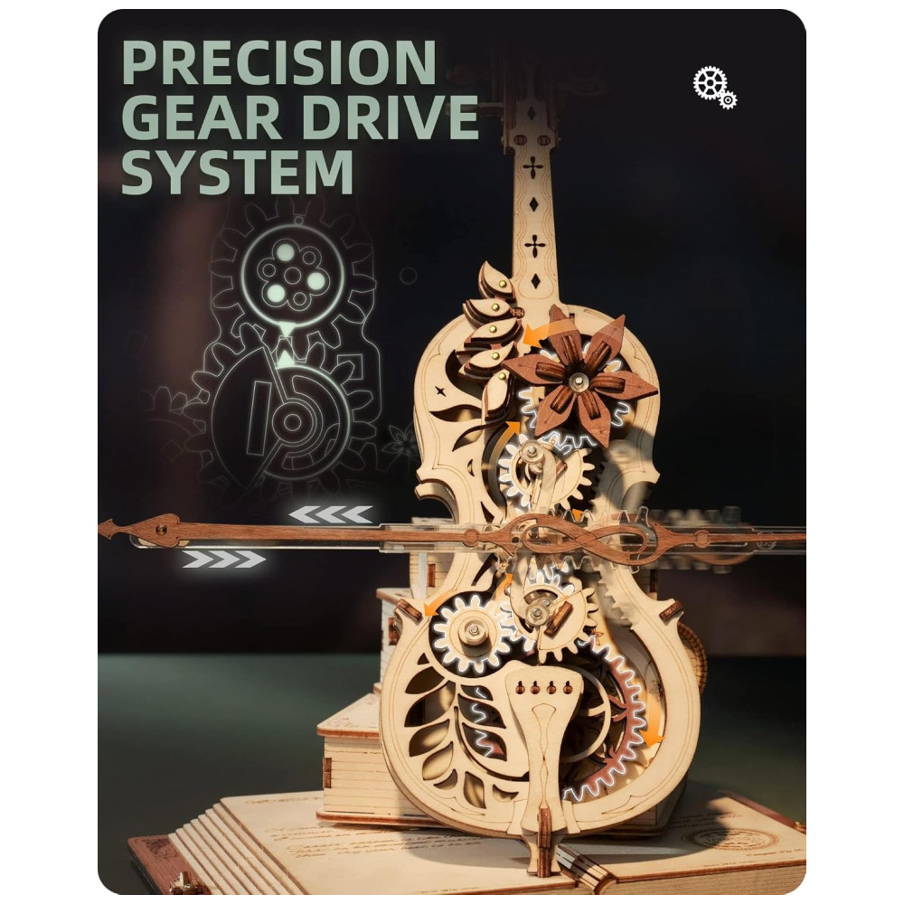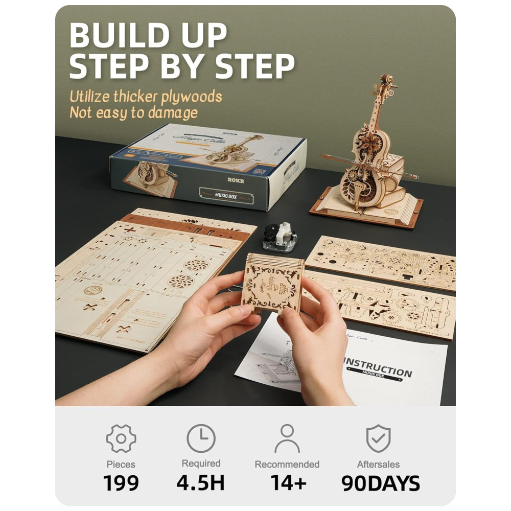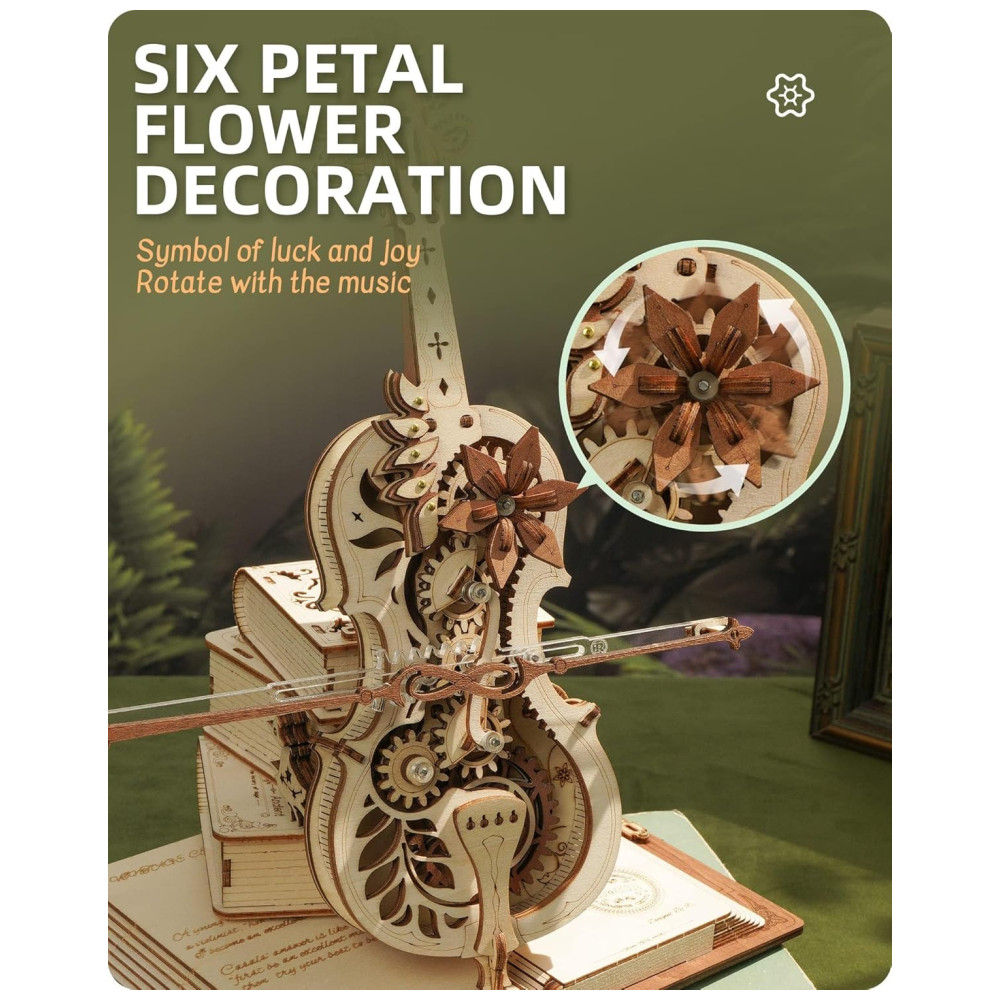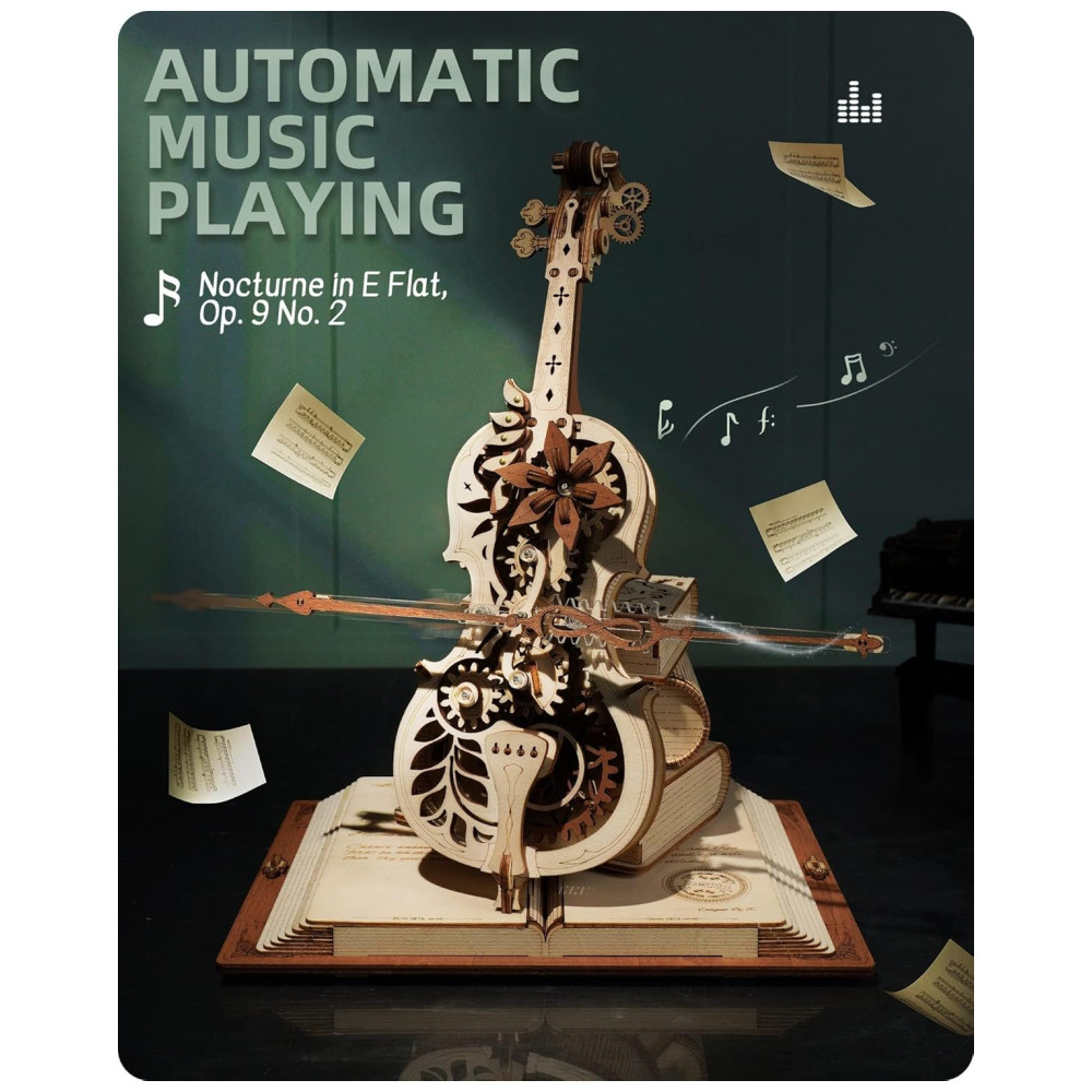 Este kit de caixa de música de madeira ROKR é um quebra cabeça 3D que leva cerca de 4,5 horas para ser construído. Depois de montado, ao enrolar o violoncelo, o arco começa a se mover e o violoncelo começa a tocar a música de Chopin. Este modelo de kit de violoncelo é uma ótima ideia de presente de feriado ou aniversário para mulheres e homens, e vem com um lindo pacote.