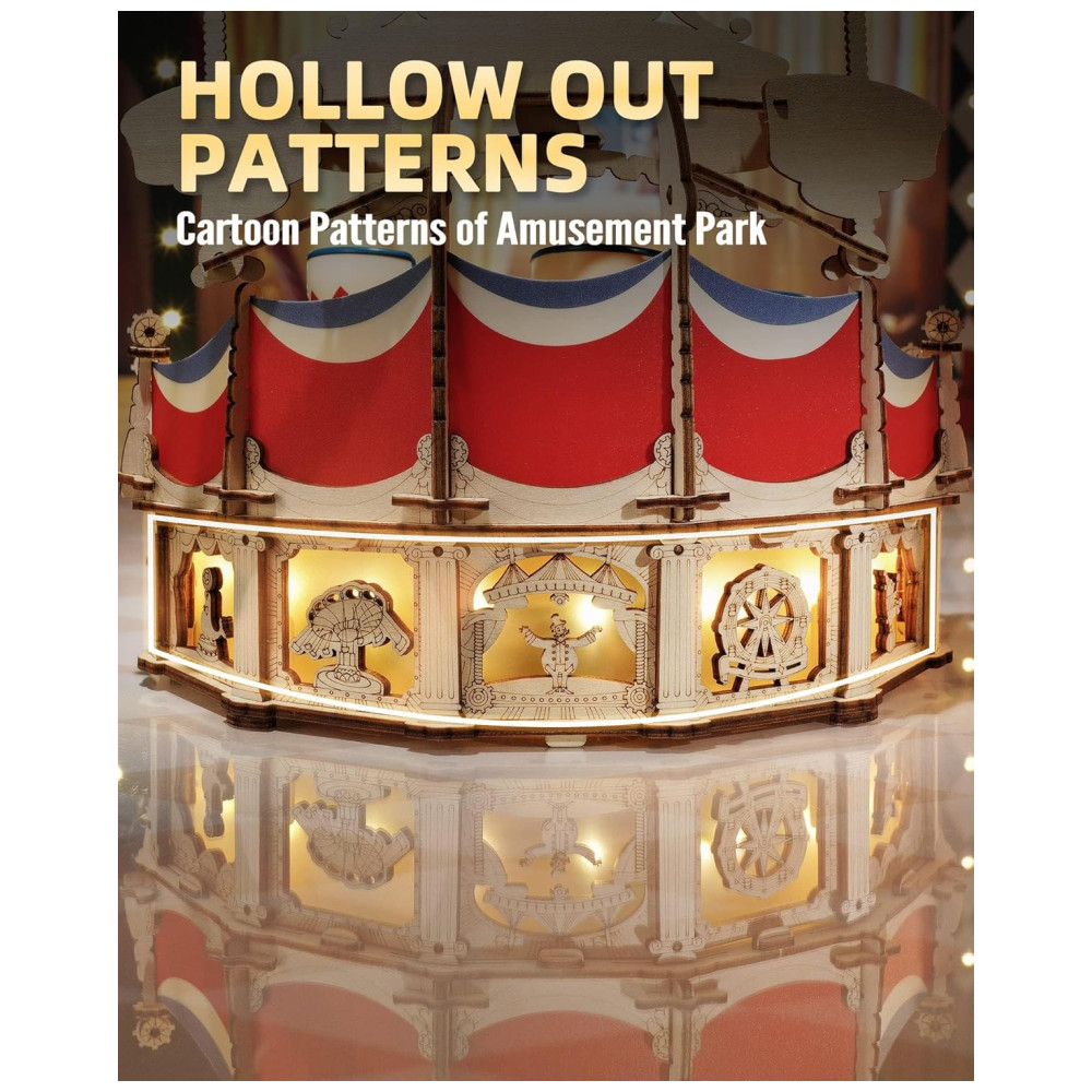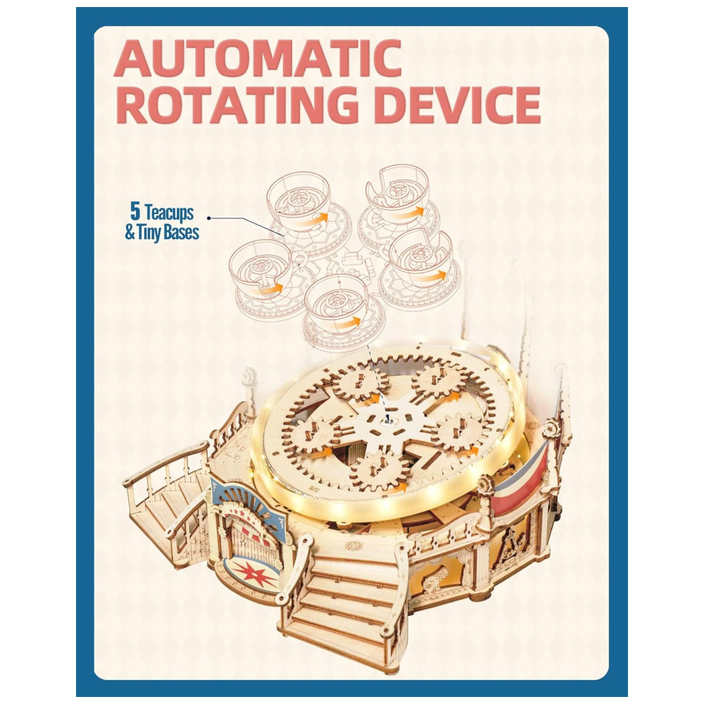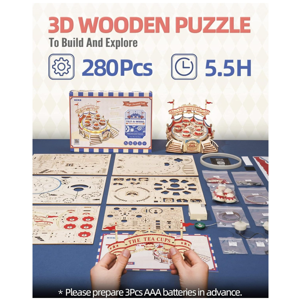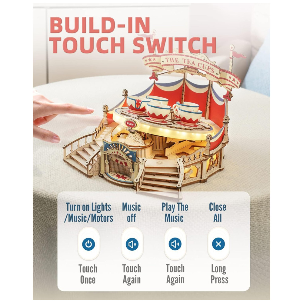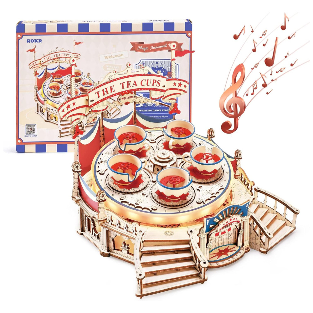 O ROKR LED Wooden Music Box Kit oferece uma experiência única com suas Xícaras de Chá Giratórias, um quebra-cabeça 3D de madeira que leva aproximadamente 5,5 horas para ser concluído. Ao pressionar o botão, as luzes se acendem e a música começa a tocar, enquanto os mini assentos giram automaticamente, proporcionando um encanto especial.