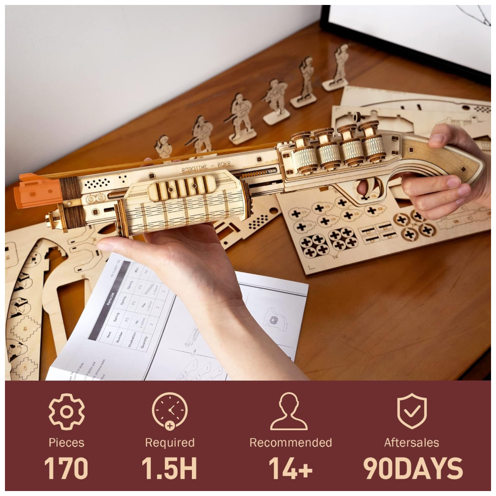 Oferecemos um livreto de instruções detalhado, com tutoriais passo a passo fáceis de seguir para este quebra cabeça de madeira. Este kit de modelo de arma é adequado para adultos, crianças mais velhas e amadores de todos os níveis de habilidade. A ROKR utiliza tecnologia líder do setor para produzir quebra cabeças de madeira 3D de qualidade. Todas as peças são cortadas a laser e o erro é muito baixo, certificando se de que cada peça se encaixe perfeitamente.