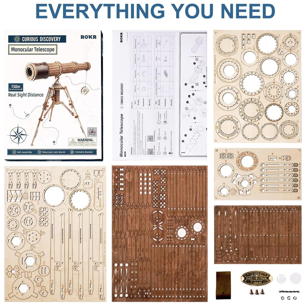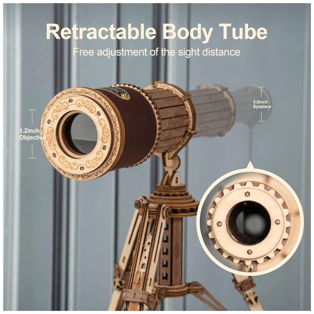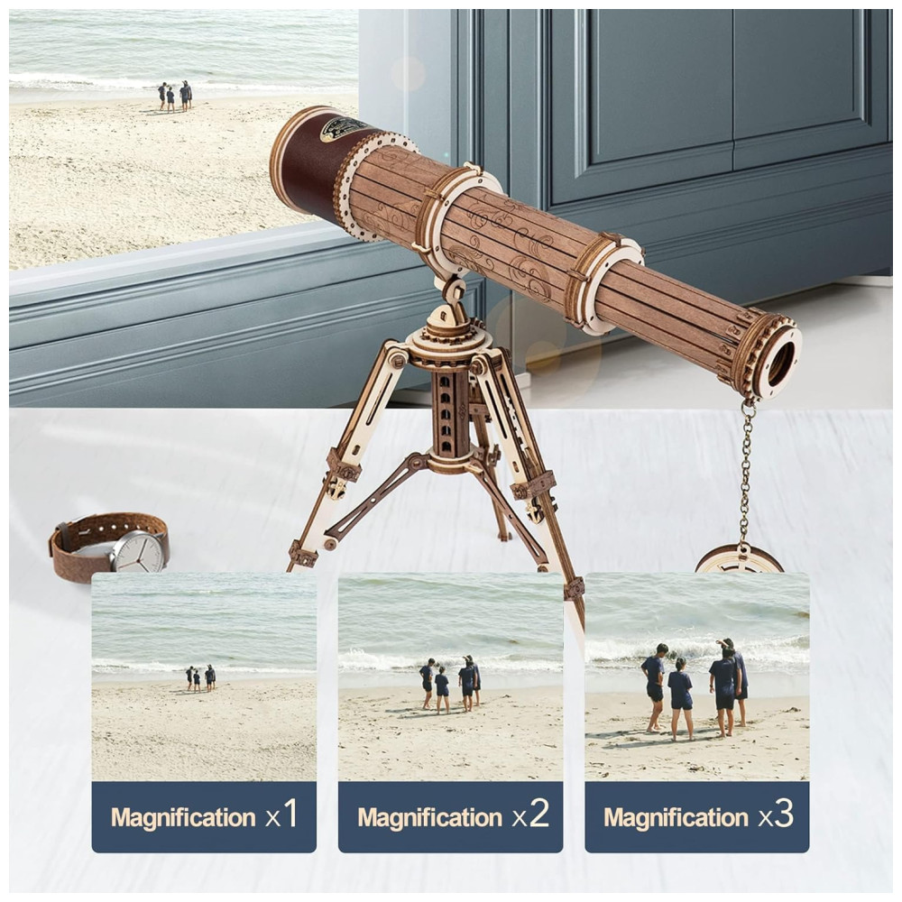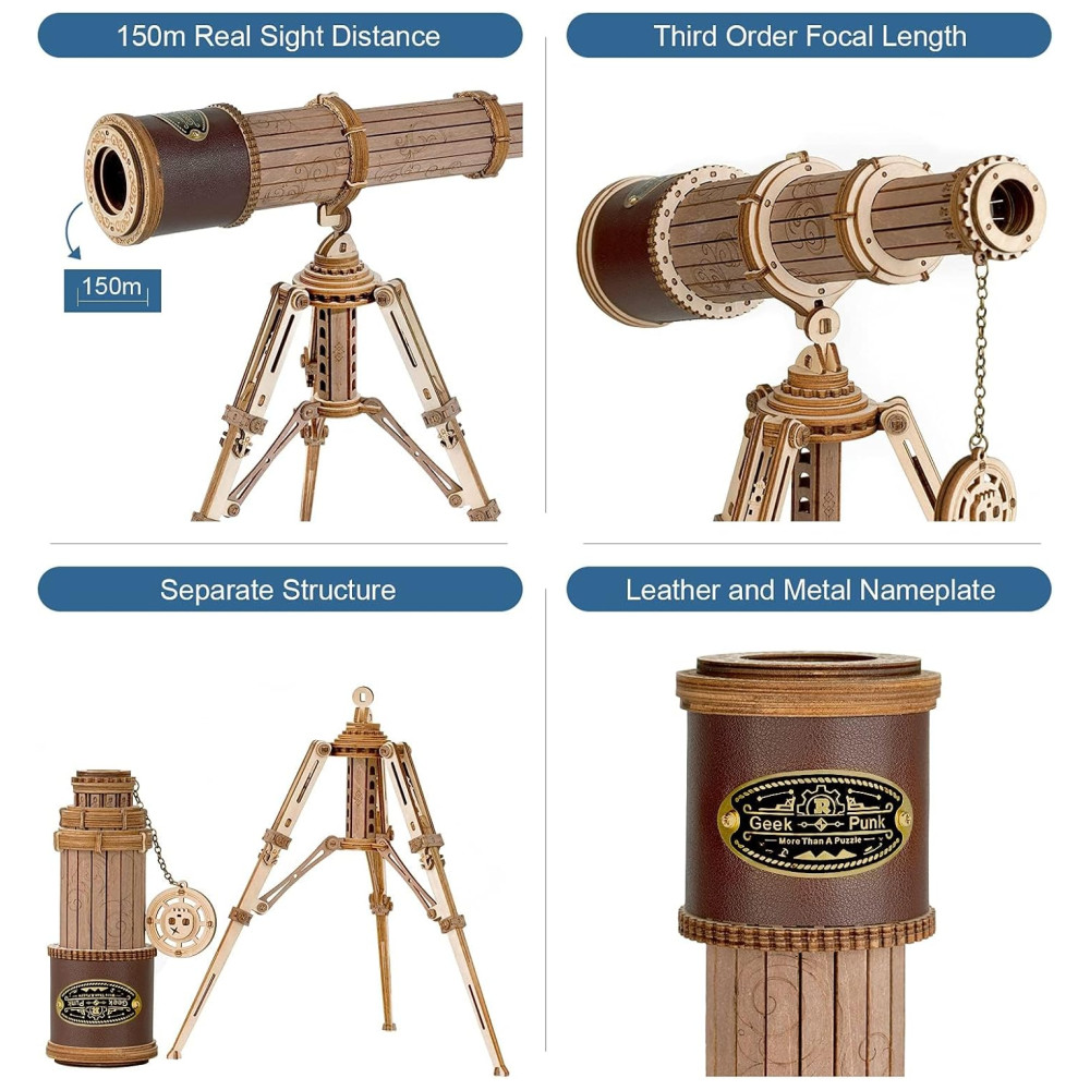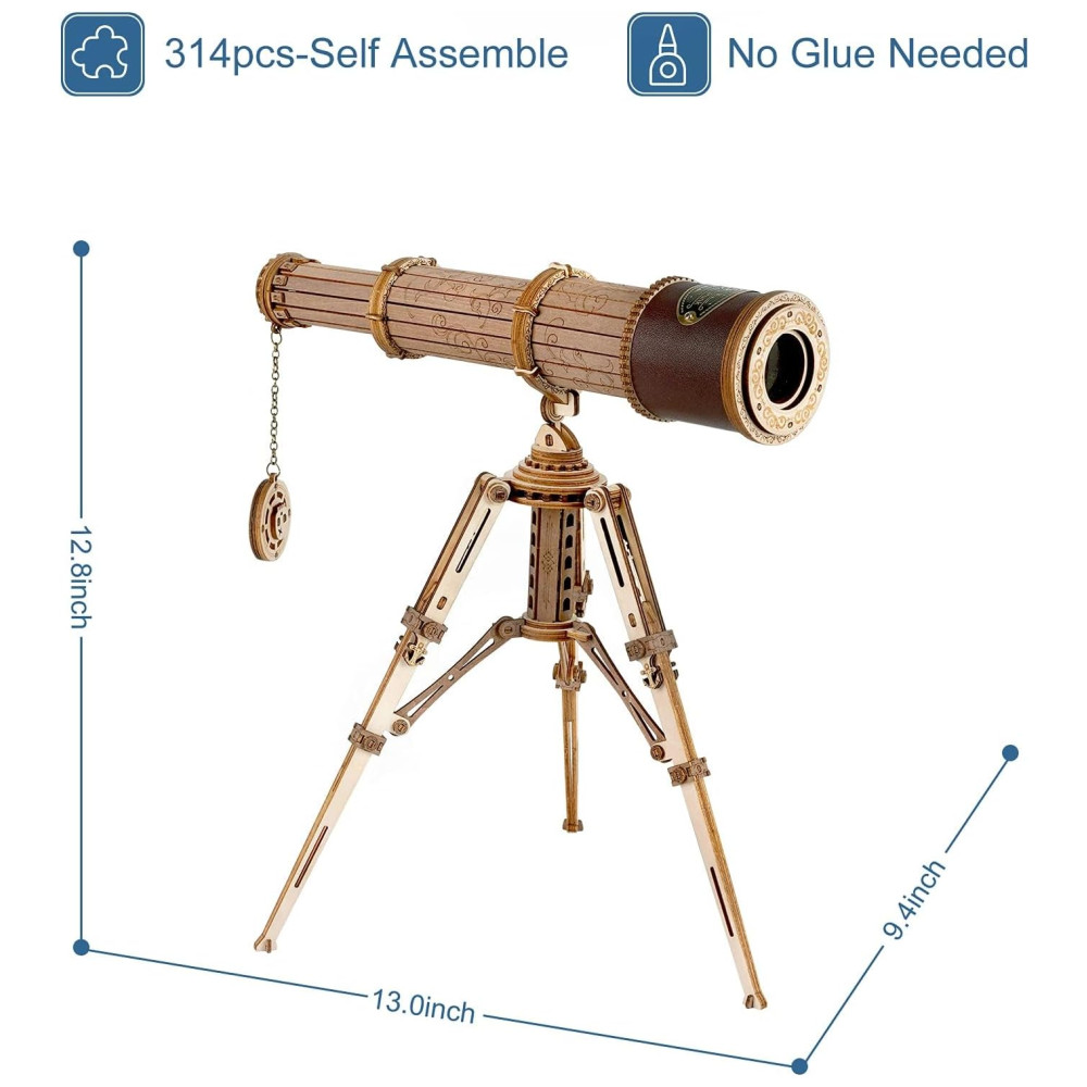 Quebra Cabeças 3D em Madeira para Adultos Tema Telescópio Monocular com 314 Peças ROKR ST004 Marrom