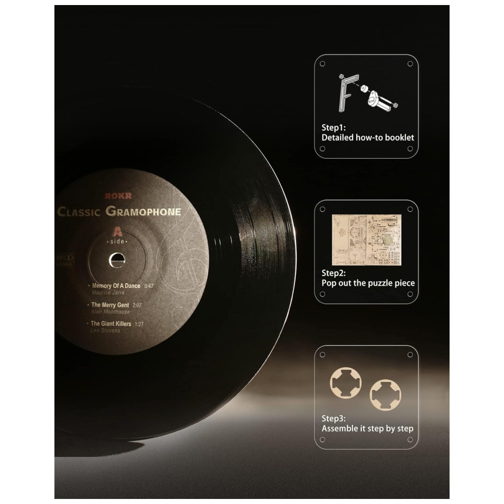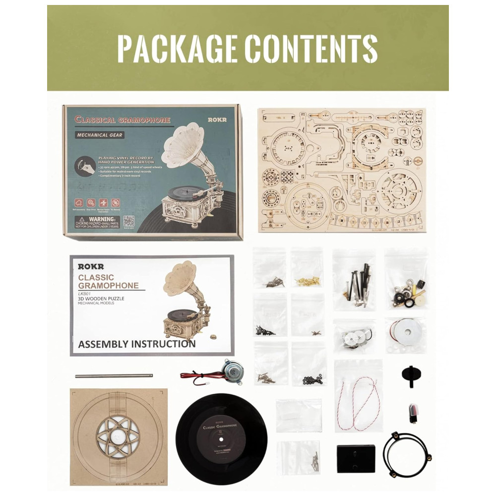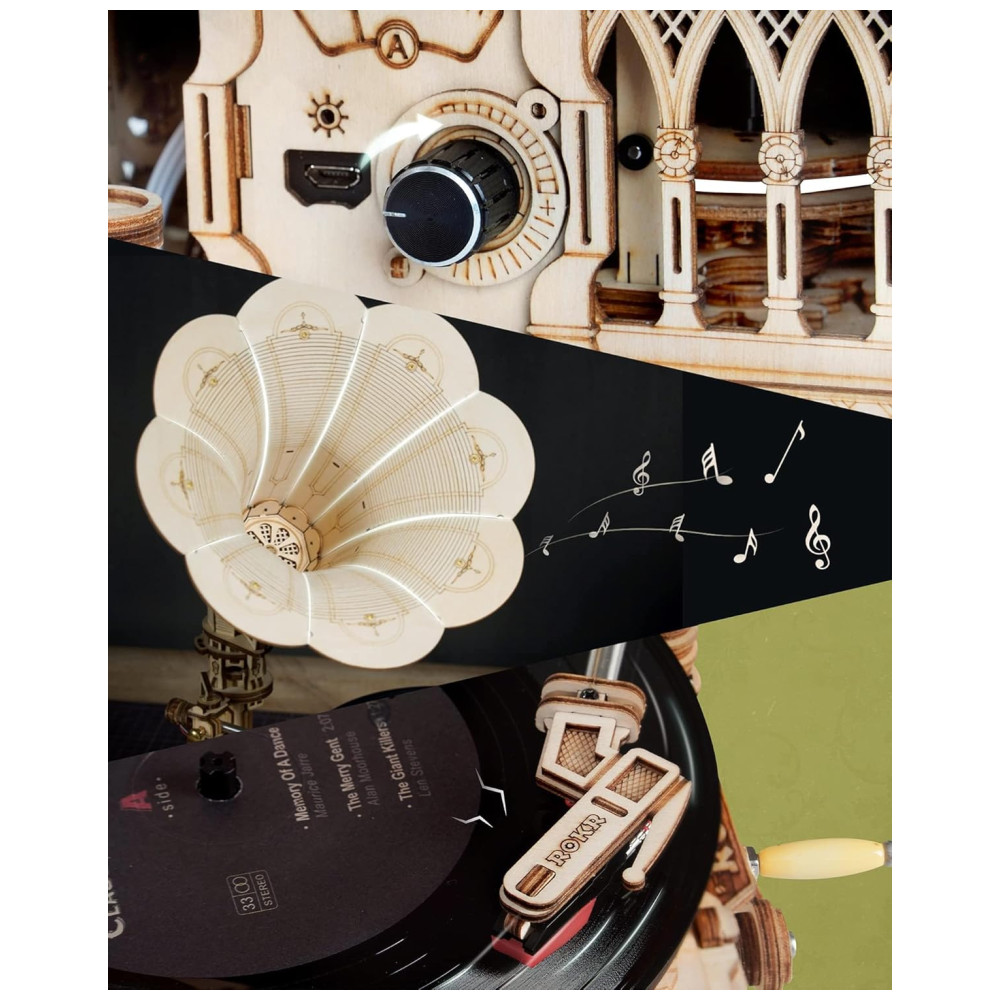 O pacote vem com um disco de vinil contendo 3 músicas, mas também é compatível com outros discos de vinil que você possa ter. As peças são feitas de basswoods selecionados em alta latitude e cortadas com tecnologia de corte a laser da Alemanha, garantindo precisão e qualidade em cada detalhe. Cada peça de madeira é marcada a laser com um código único para facilitar a montagem.