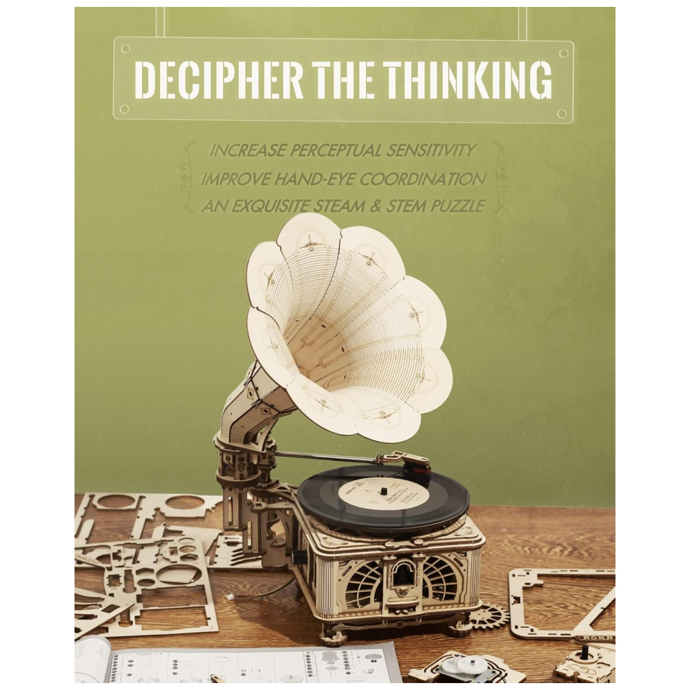 O Quebra Cabeças 3D é um kit de modelo de madeira que combina habilmente design mecânico com materiais de alta qualidade. Com uma alça giratória, o disco de vinil pode ser reproduzido manualmente, sem a necessidade de energia elétrica. O kit também inclui um botão de volume manual e uma grande buzina giratória para completar a experiência retro.
