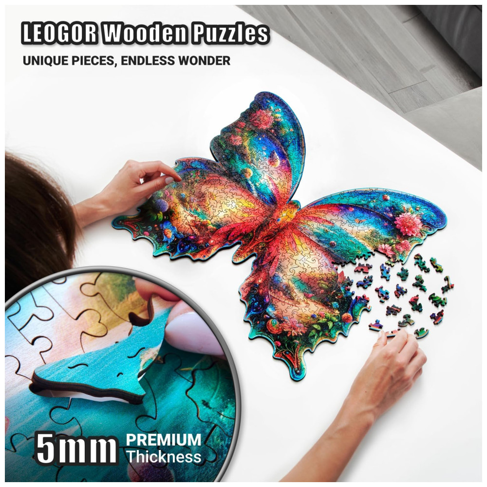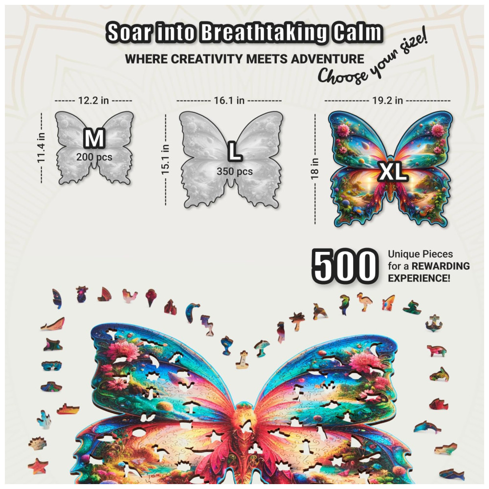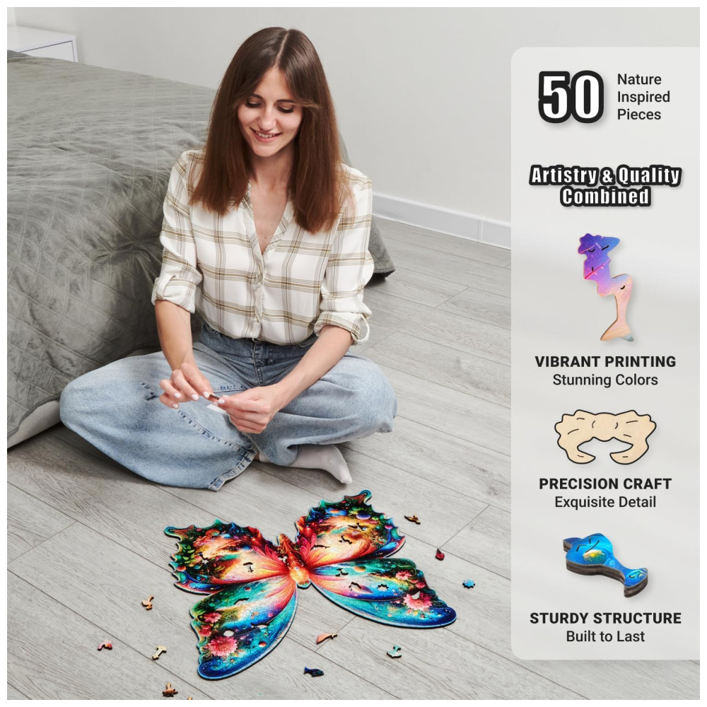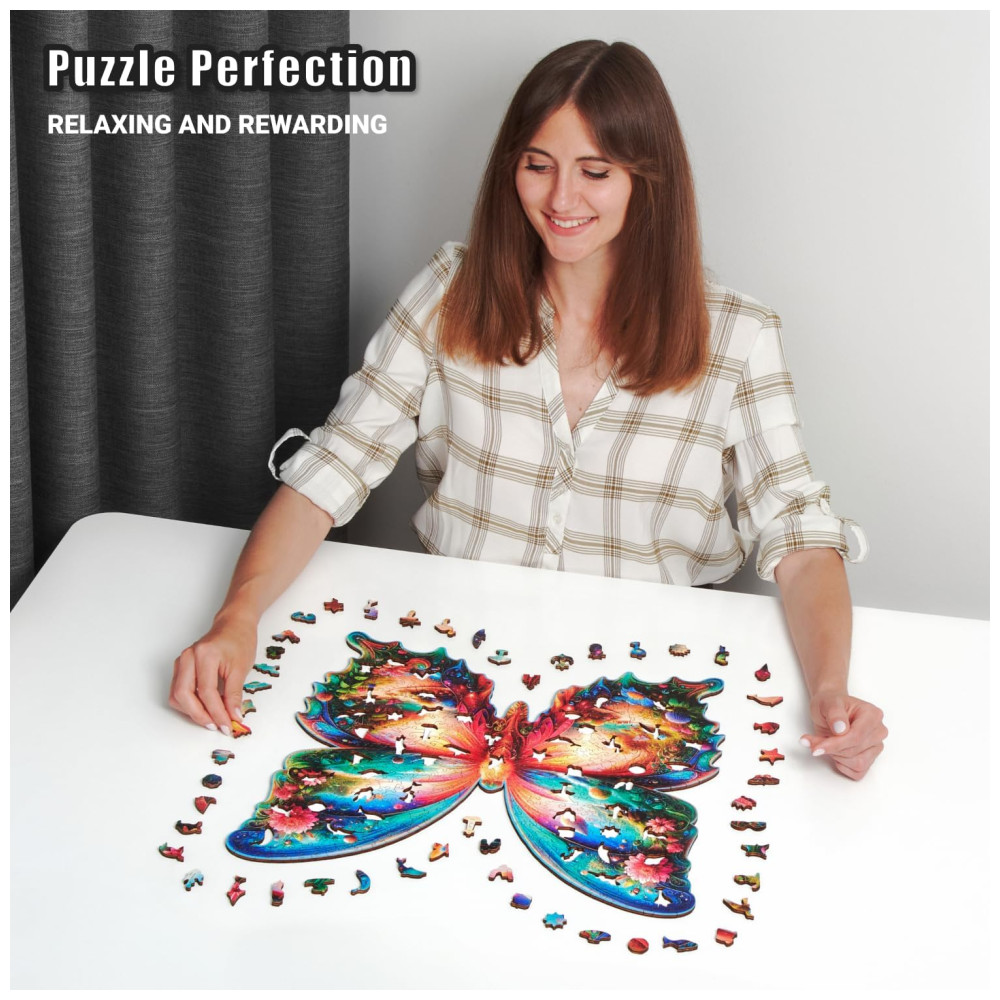 Com uma mistura de formas estranhas e extravagantes em formato de animais, este quebra cabeça de borboleta em madeira é uma experiência divertida e desafiante. Além disso, é um quebra cabeças avançado infundido com magia, mistério e fantasia que promove a resolução de problemas culminando em um triunfo do intelecto.
