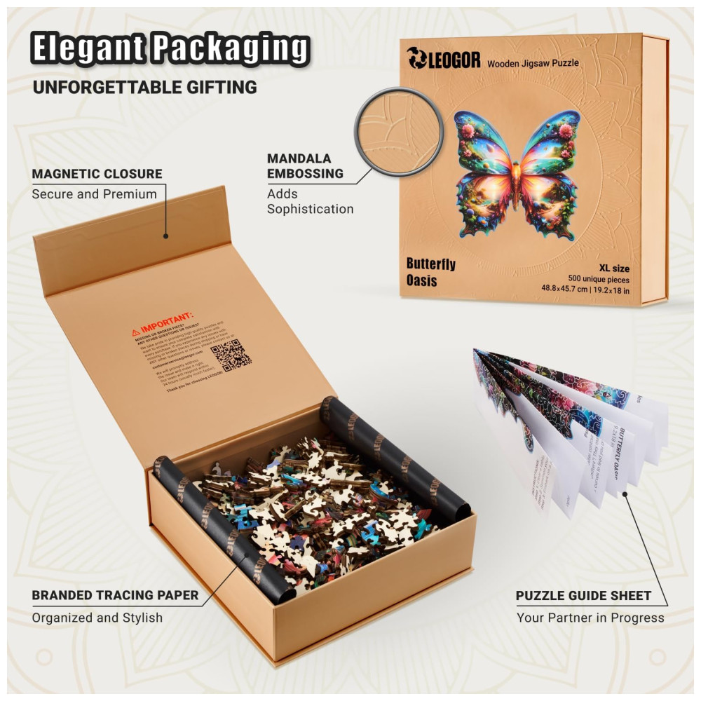 Este quebra cabeça de borboleta é feito com madeira de alta qualidade de 5 mm e corte a laser de precisão, garantindo que cada peça se encaixe perfeitamente. Com um conjunto de 50 formas extravagantes, como insetos vibrantes, flores, grandes e pequenas plantas, este quebra cabeça de madeira de 500 peças oferece um mosaico colorido da beleza da natureza, encantando os fãs de arte e vida selvagem.