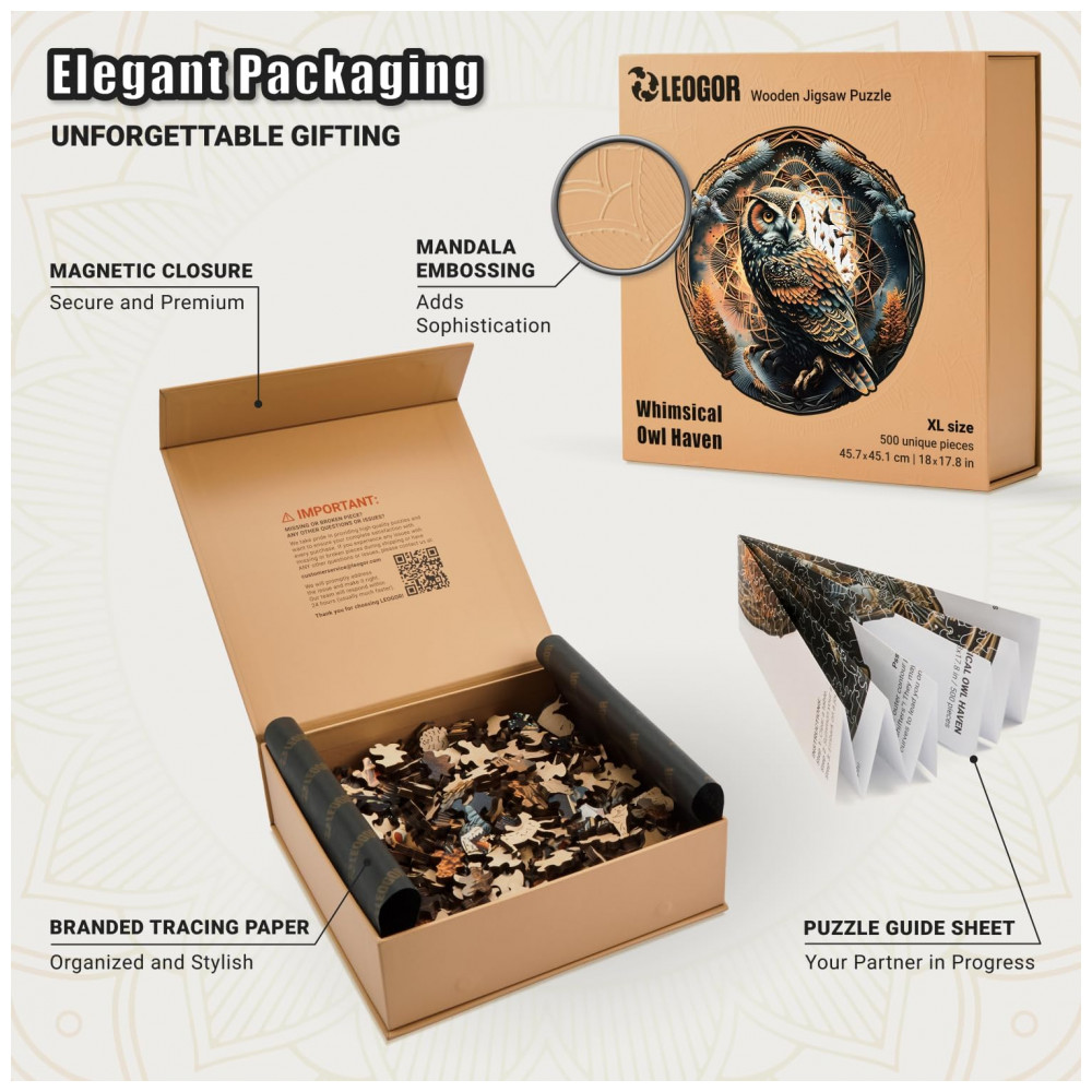 Quebra Cabeças em Madeira MDF para Adultos Tema Coruja com 500 Peças LEOGOR Preto e Marrom