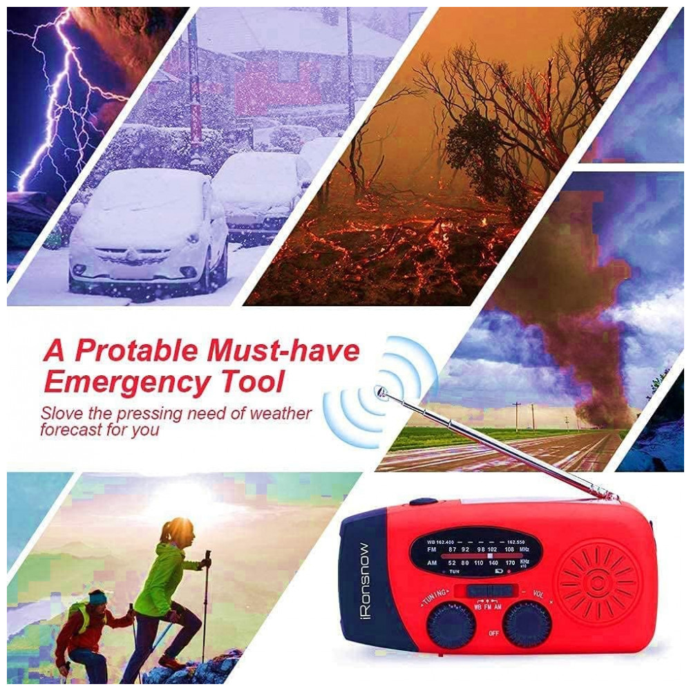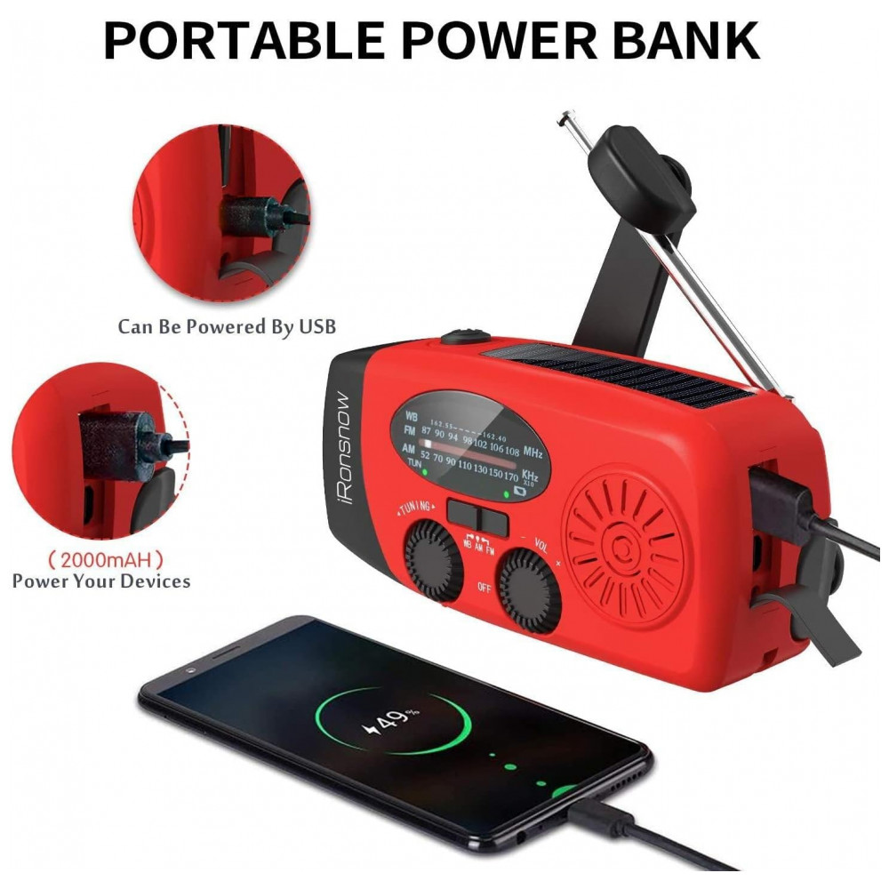 3 maneiras recarregáveis Carregamento rápido por USB é a principal forma de energia no uso diário, manivela e energia solar essas duas fontes de energia são capazes de regenerar energia para manter o rádio quando você precisar em uma emergência. Ligue a qualquer hora e em qualquer lugar. Mantenha seu telefone e dispositivos online o tempo todo.