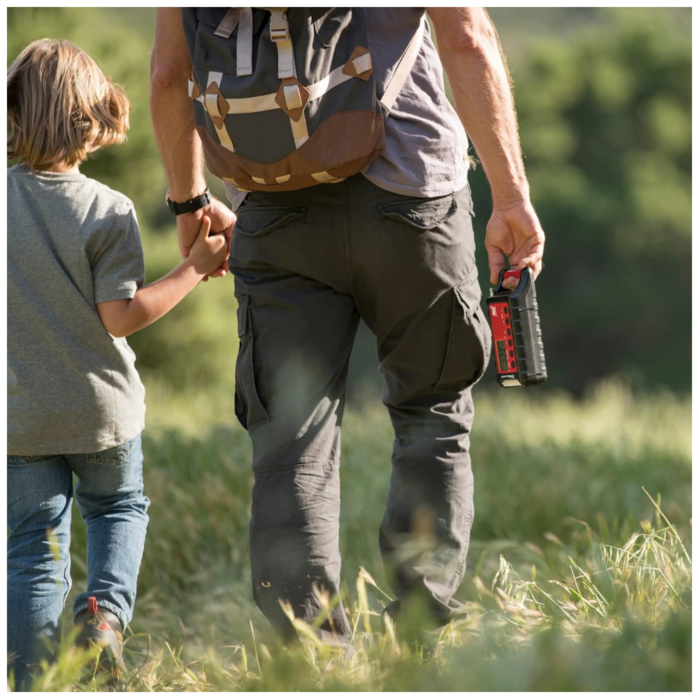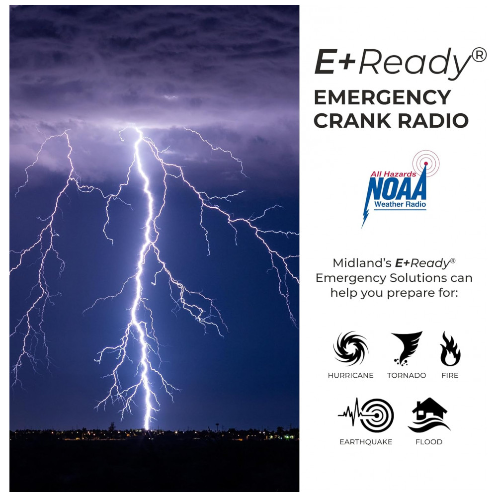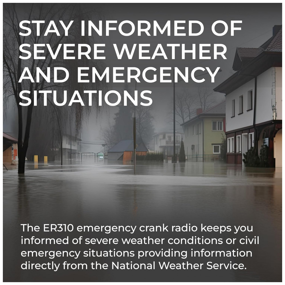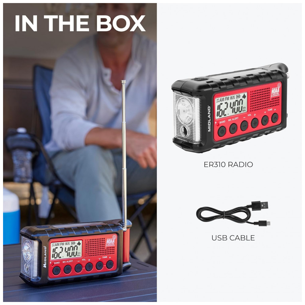 VÁRIAS FONTES DE ALIMENTAÇÃO O ER310 possui 3 fontes de energia sustentáveis para recarregar seu rádio Painel Solar, Manivela e Bateria Recarregável de 2600 mAh. PAINEL SOLAR Simplesmente recarregue a bateria interna de íons de lítio com luz solar direta. MANUAL Recarregue o rádio durante uma queda de energia ou a qualquer momento longe de uma fonte de energia. BATERIA RECARREGÁVEL 2600 mAh A bateria recarregável e substituível de longa duração fornece até 32 horas de operação de rádio. O ER310 também pode ser alimentado por 6 pilhas AA não incluídas como uma solução de energia de reserva. LANTERNA DE EMERGÊNCIA O SOS pisca o código Morse em um cenário de emergência e o Bright CREE LED 130 Lumens pode ser para sinalizar para obter ajuda. Selecione a configuração de baixo brilho para economizar a bateria ou a configuração de alto brilho para obter o máximo de iluminação. NOAA Weather Scan ALERT O NOAA Weather Scan pesquisará automaticamente 7 canais de banda climática disponível WX e trava no canal climático mais forte para alertá lo sobre atualizações climáticas severas. O NOAA Weather Alert emitirá um alarme indicando que existe um risco de mau tempo na sua área. Rádio AM , FM também está disponível. CARREGAR DISPOSITIVOS EXTERNOS Carregue rapidamente seus dispositivos portáteis telefones celulares, tablets etc. usando o cabo de carregamento USB incluído. apito de cão ultra sonoro use o apito para ajudar as equipes de busca e resgate a localizar indivíduos durante uma situação de emergência