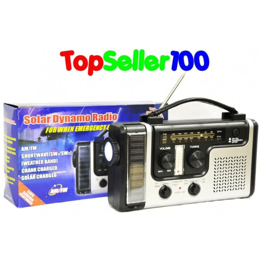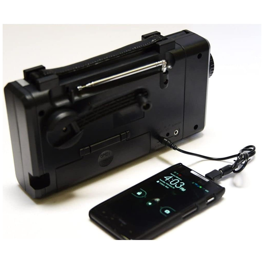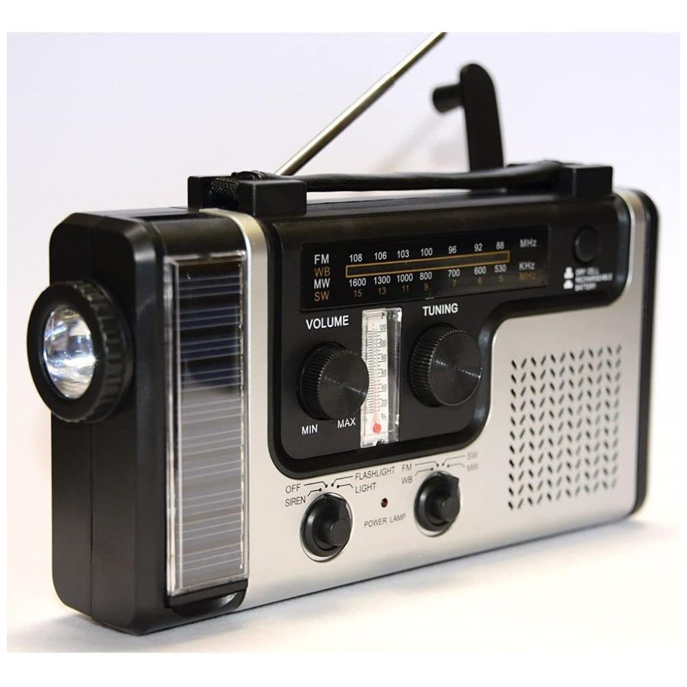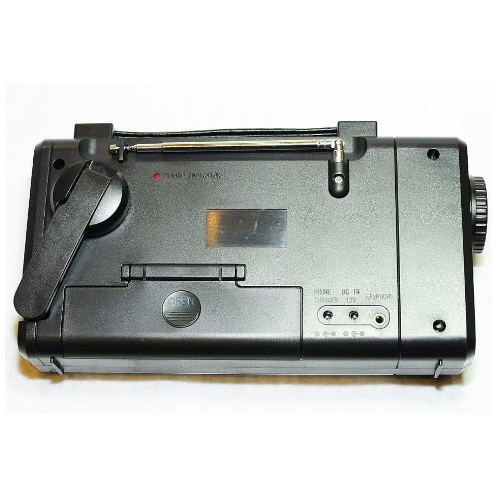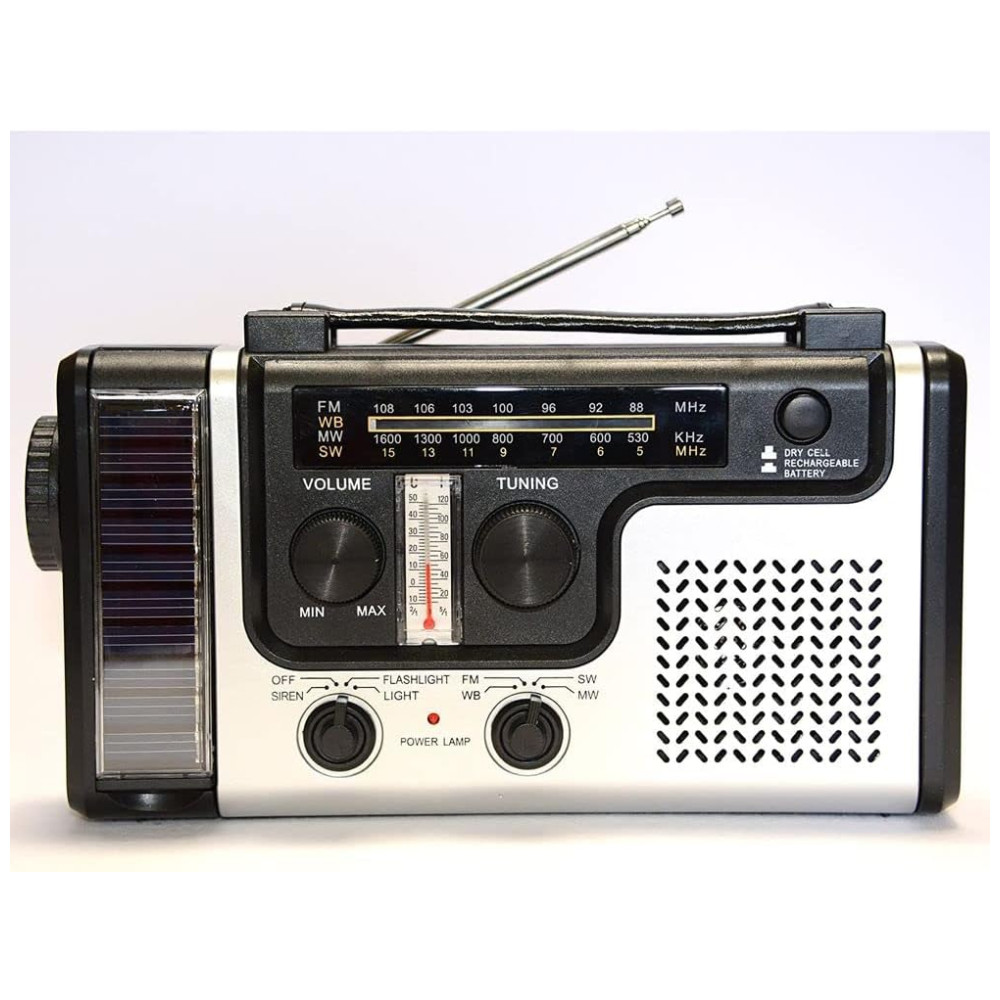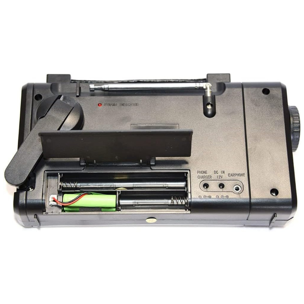 Ele vem com rádio AM , FM , SW , banda climática, termômetro, conector de carregador de celular, adaptador de carregador DC para USB, lanterna LED brilhante e uma luz de leitura LED invertida.