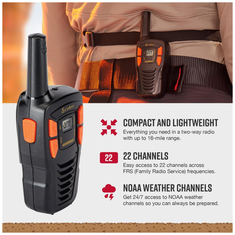 O Cobra ACXT145 é um rádio walkie talkie bidirecional compacto e leve, com alcance de até 16 milhas. Ideal para comunicação clara em ambientes internos e externos, possui alertas meteorológicos NOAA, tom de bipe Roger e modo de economia de bateria automático após 10 segundos. Com fácil acesso a 22 canais nas frequências do FRS Family Radio Service, é perfeito para atividades ao ar livre como caminhadas ou caça. Além disso, conta com canais de tempo da NOAA para que você esteja sempre preparado para más condições climáticas. O tom de bipe de confirmação garante uma comunicação clara em qualquer ambiente, tornando o ideal para áreas de trabalho como hotéis, segurança escolar, mercados, áreas de construção e shows.