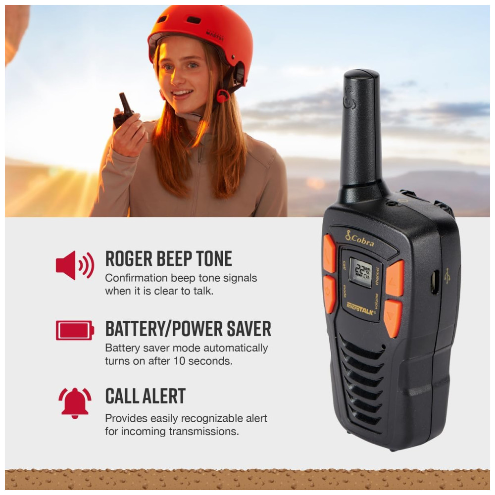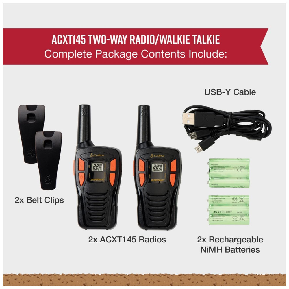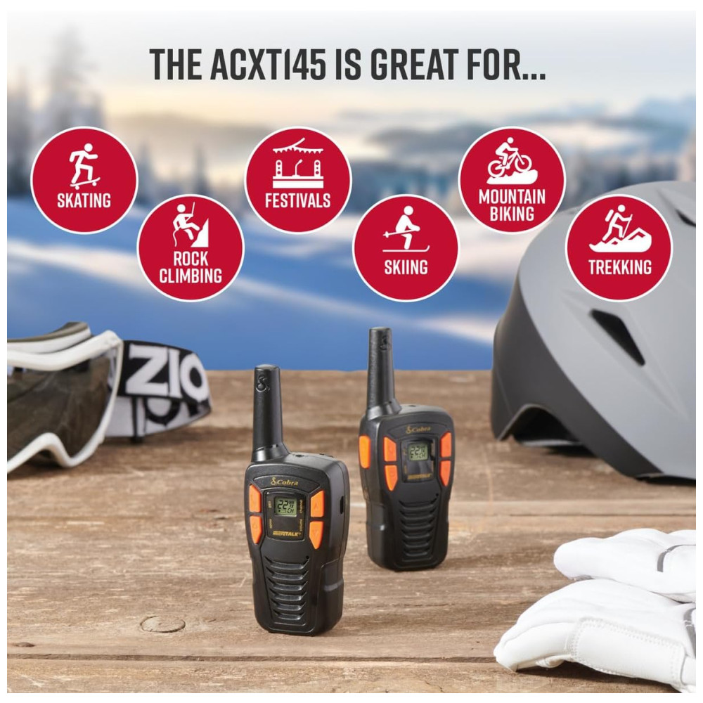 Rádio Comunicador Walkie Talkie Cobra ACXT145 Compacto Recarregável Leve 22 Canais Alcance de 25 km Rádio de 2 Vias (2 Unidades) Preto.