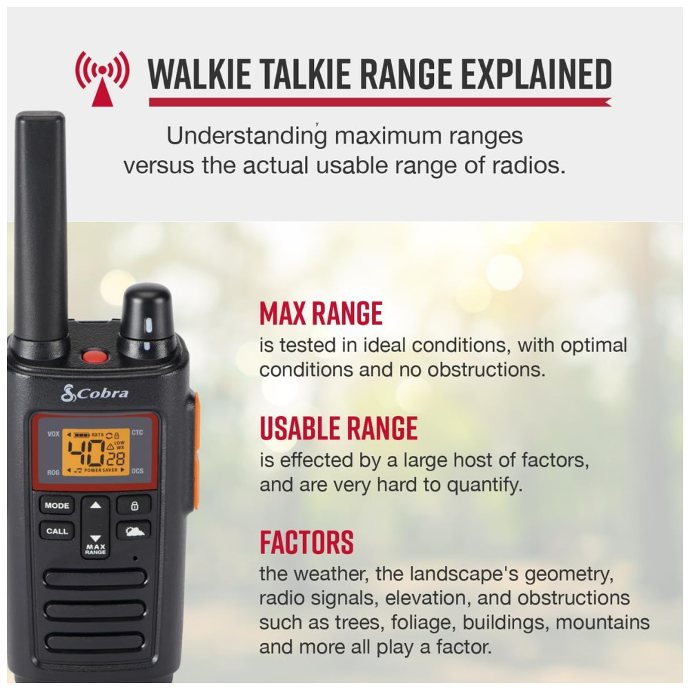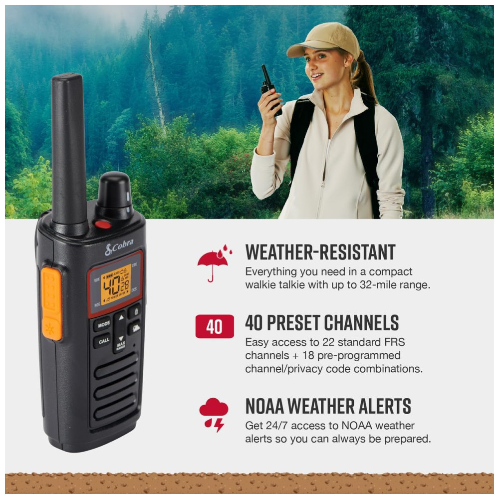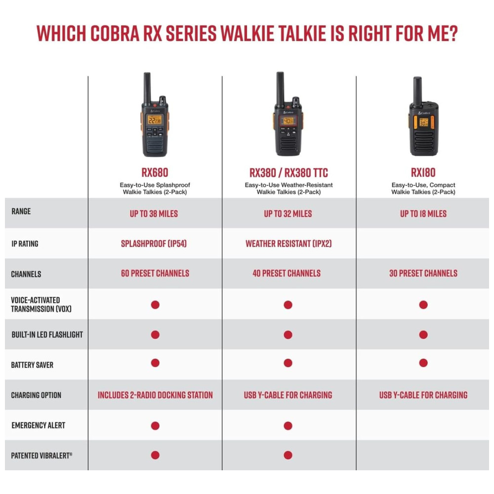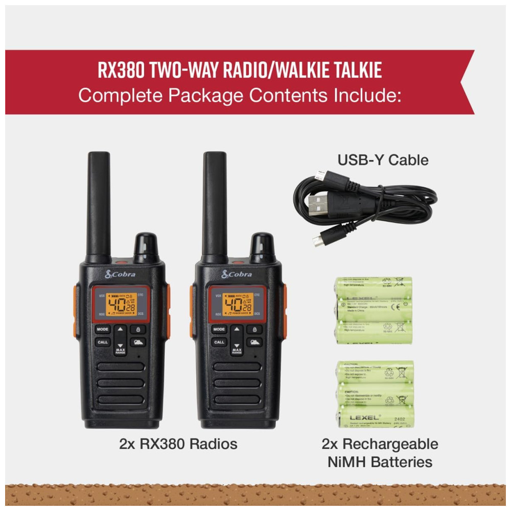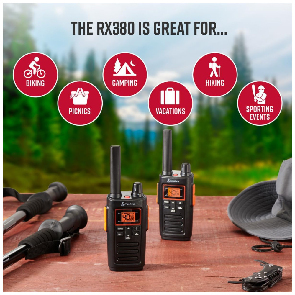 O Cobra RX380 é um par de walkie talkies compactos e resistentes às intempéries, ideais para aventuras ao ar livre. Com alcance de até 32 milhas, estes walkie talkies são perfeitos para a maioria das condições externas, sendo resistentes à água e ao gotejamento, embora não suportem imersão em água.