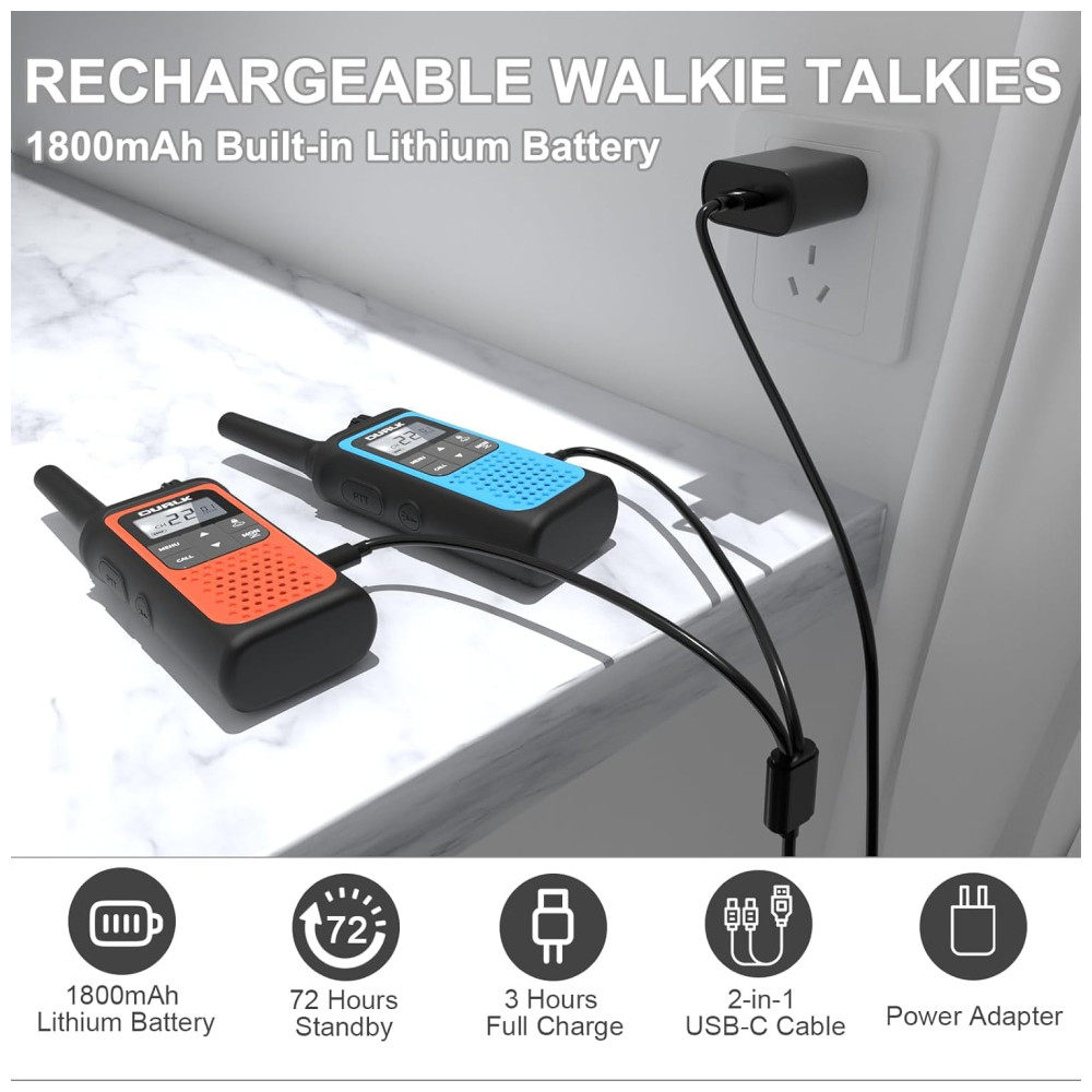 Além disso, eles vêm com bateria de lítio de 1800 mAh integrada, sem necessidade de instalar bateria adicional, e um cabo de carregamento USBC 2 em 1 e adaptador, permitindo que você carregue 2 walkie talkies ao mesmo tempo. Após uma carga completa de 4 horas, é possível aproveitar até 72 horas em modo de espera, tornando os perfeitos para atividades ao ar livre.