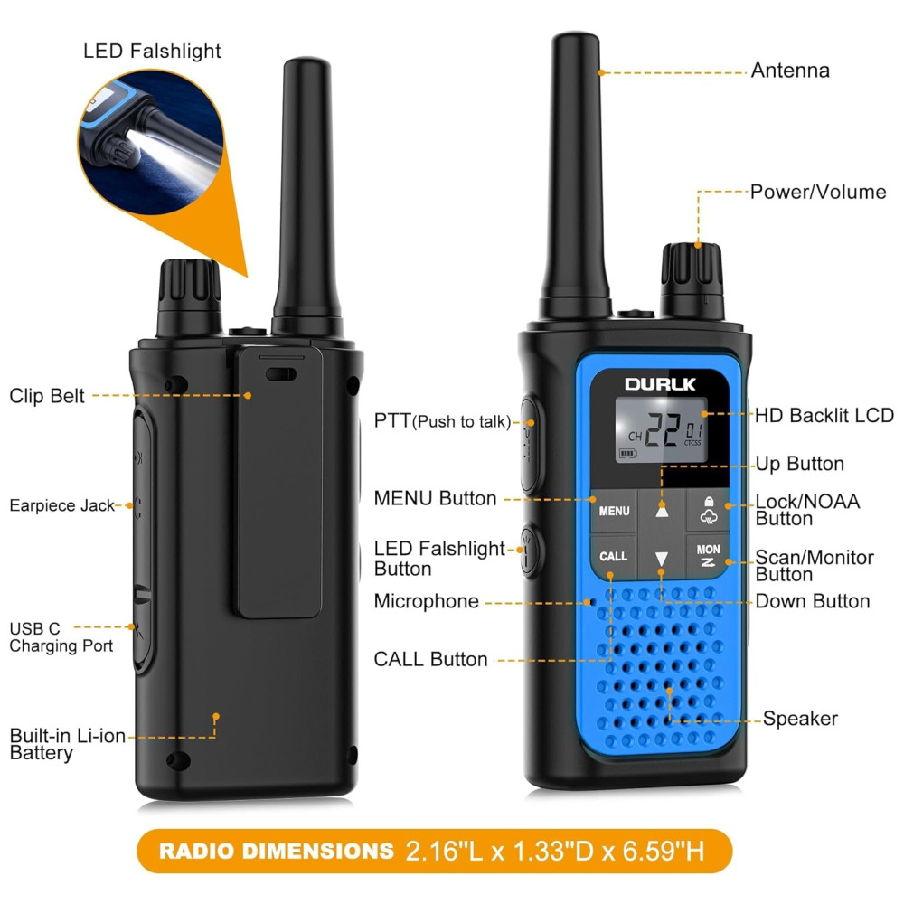 Rádio Comunicador Walkie Talkie Durlk para Adultos Longo Alcance 2 Unidades Recarregáveis 22 Canais FRS Rádio Bidirecional