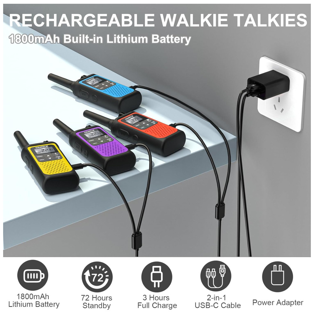 O pacote vem com cabos de carregamento USBC 2 em 1 e adaptador, permitindo que você carregue 4 walkie talkies ao mesmo tempo. A bateria de lítio integrada de 1800 mAh proporciona até 72 horas em modo de espera após uma carga completa de 4 horas. Com recursos avançados como VOX ativado por voz, viva voz, ajuste de volume, silenciador automático, memória automática, varredura automática, alerta de bateria fraca e bloqueio do teclado, os walkie talkies DURLK são adequados para uma variedade de cenários ao ar livre, incluindo esqui, caminhadas, ciclismo, acampamentos, viagens rodoviárias, cruzeiros, negócios e locais de trabalho.