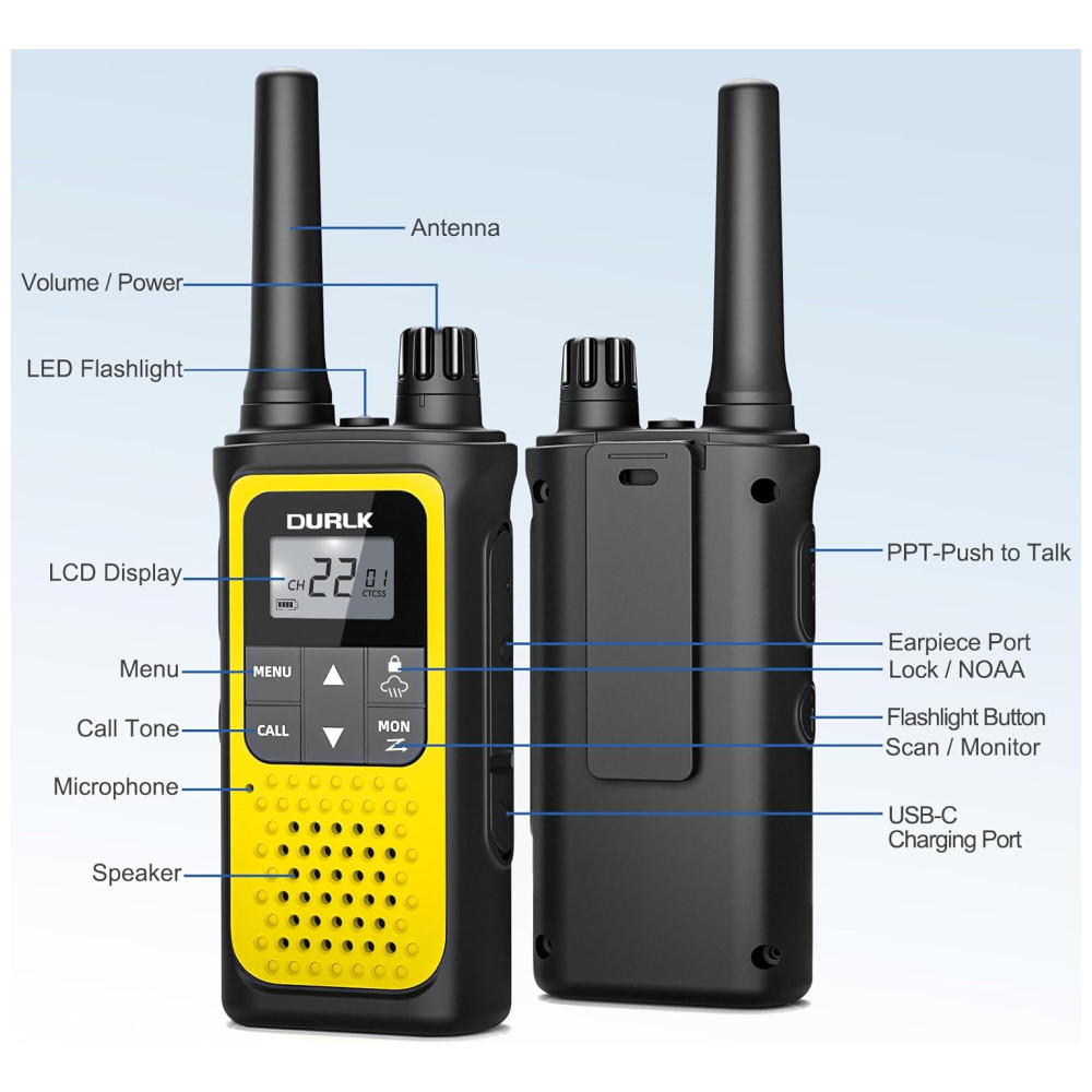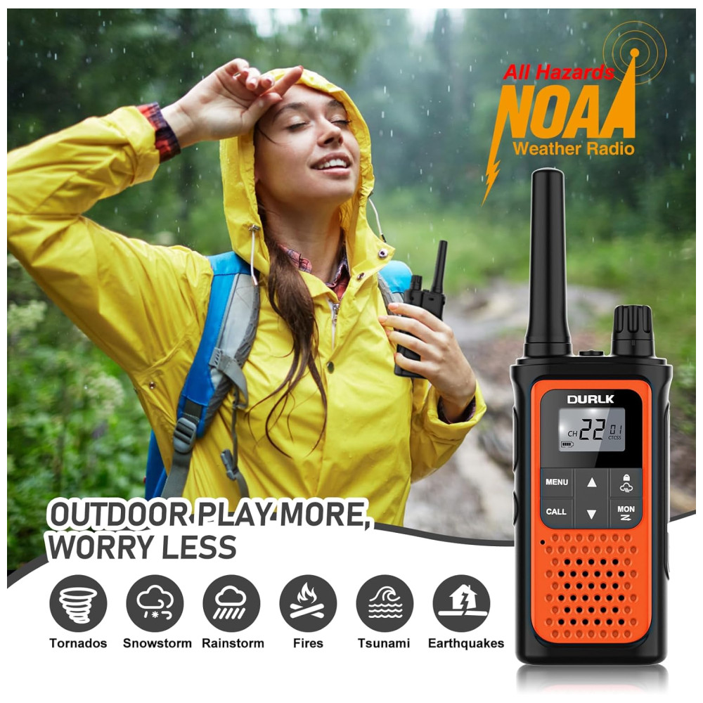Além disso, os walkie talkies DURLK possuem 10 canais meteorológicos da NOAA que fornecem atualizações em tempo real sobre as condições climáticas. Com alto falantes atualizados com 150 a mais de volume, você tem uma audição mais clara. Os walkie talkies também possuem tela LCD HD com luz de fundo, lanterna LED embutida e proteção contra quedas, aumentando sua durabilidade.