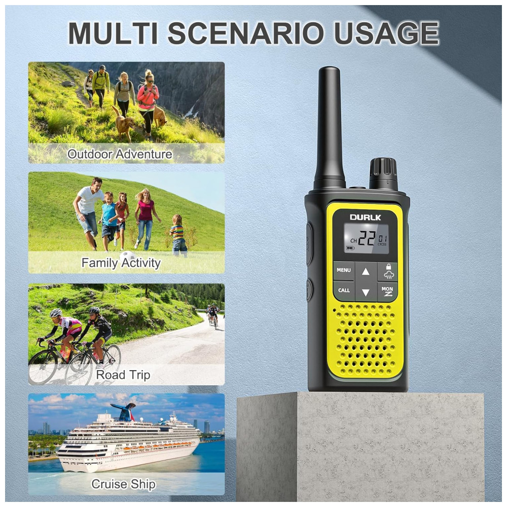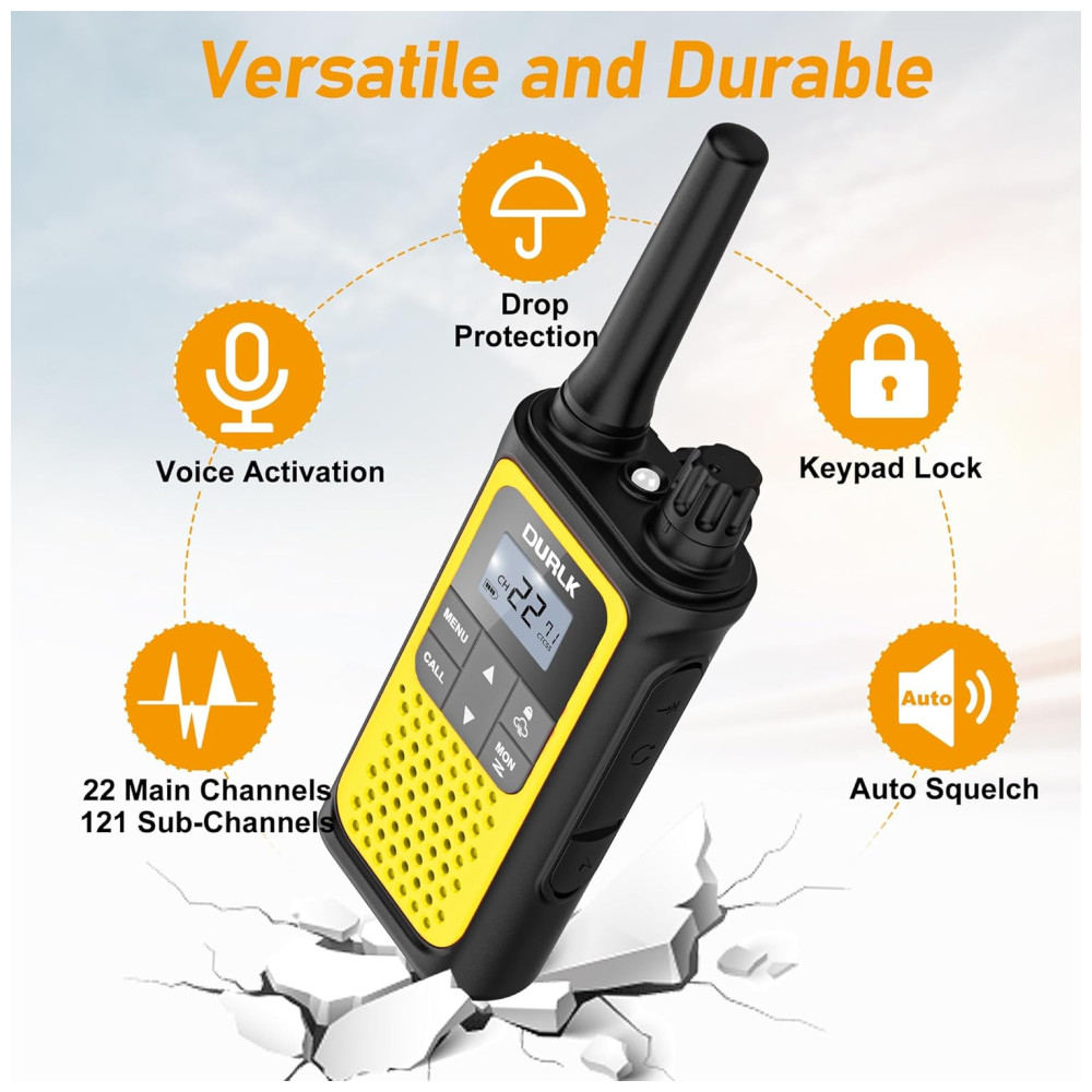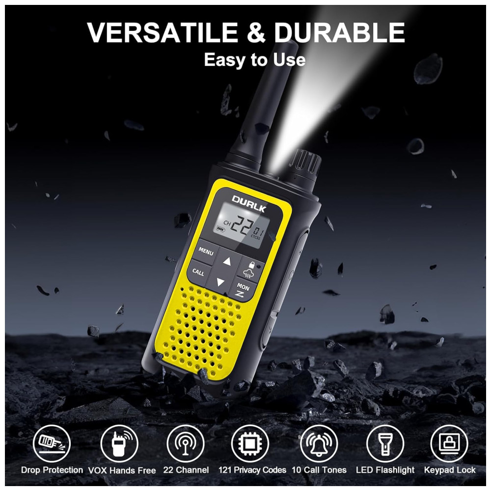 Este pacote com 4 Walkie Talkies DURLK de longo alcance é perfeito para quem busca se manter conectado em atividades ao ar livre. Com alcance de até 1,5 milhas em condições normais e 22 canais e 121 códigos de privacidade, você obtém 2.662 combinações seguras. Os walkie talkies são compatíveis com qualquer marca que utilize o mesmo canal e código de privacidade.