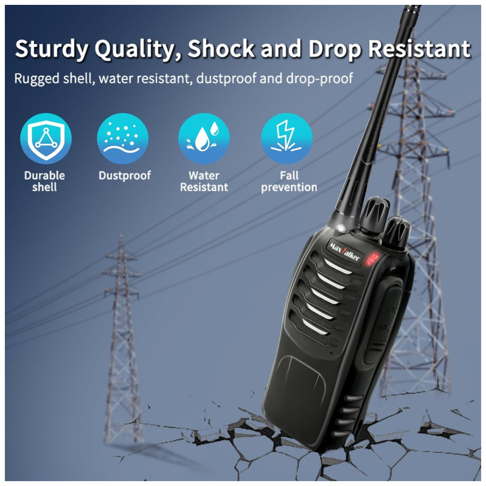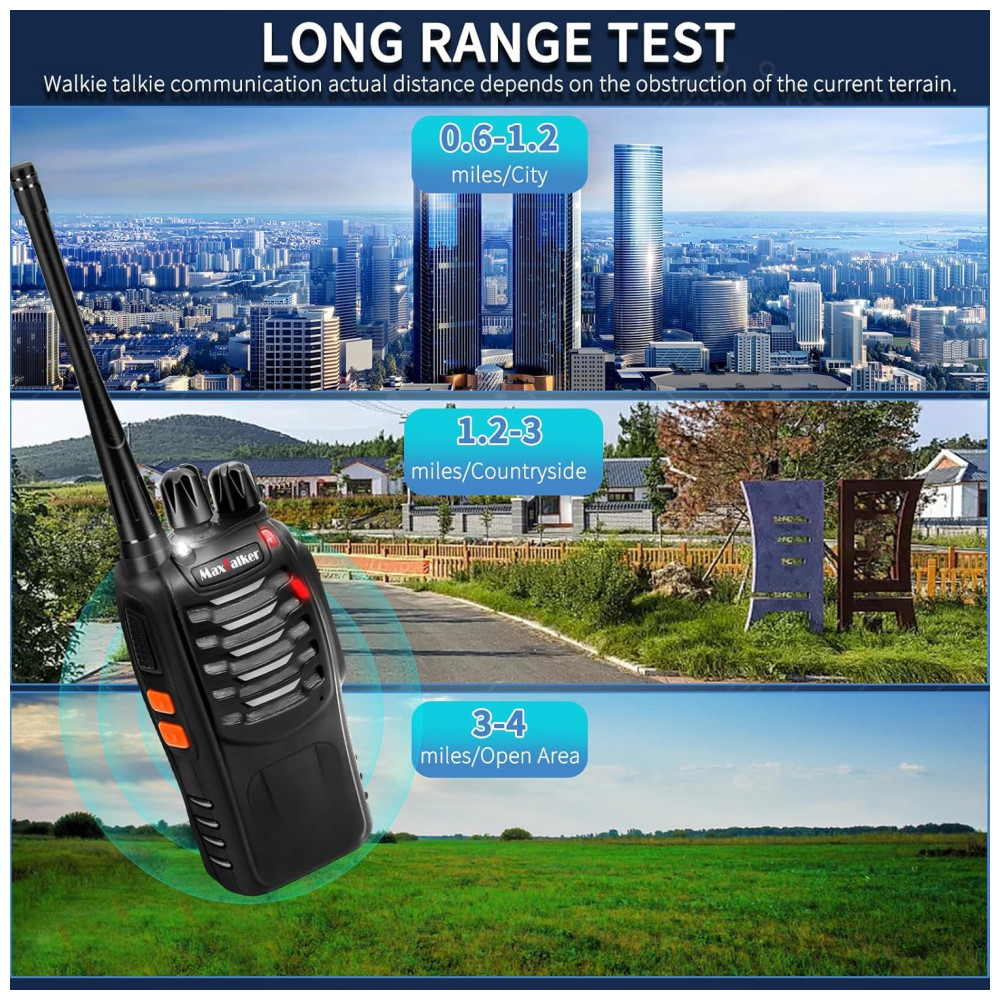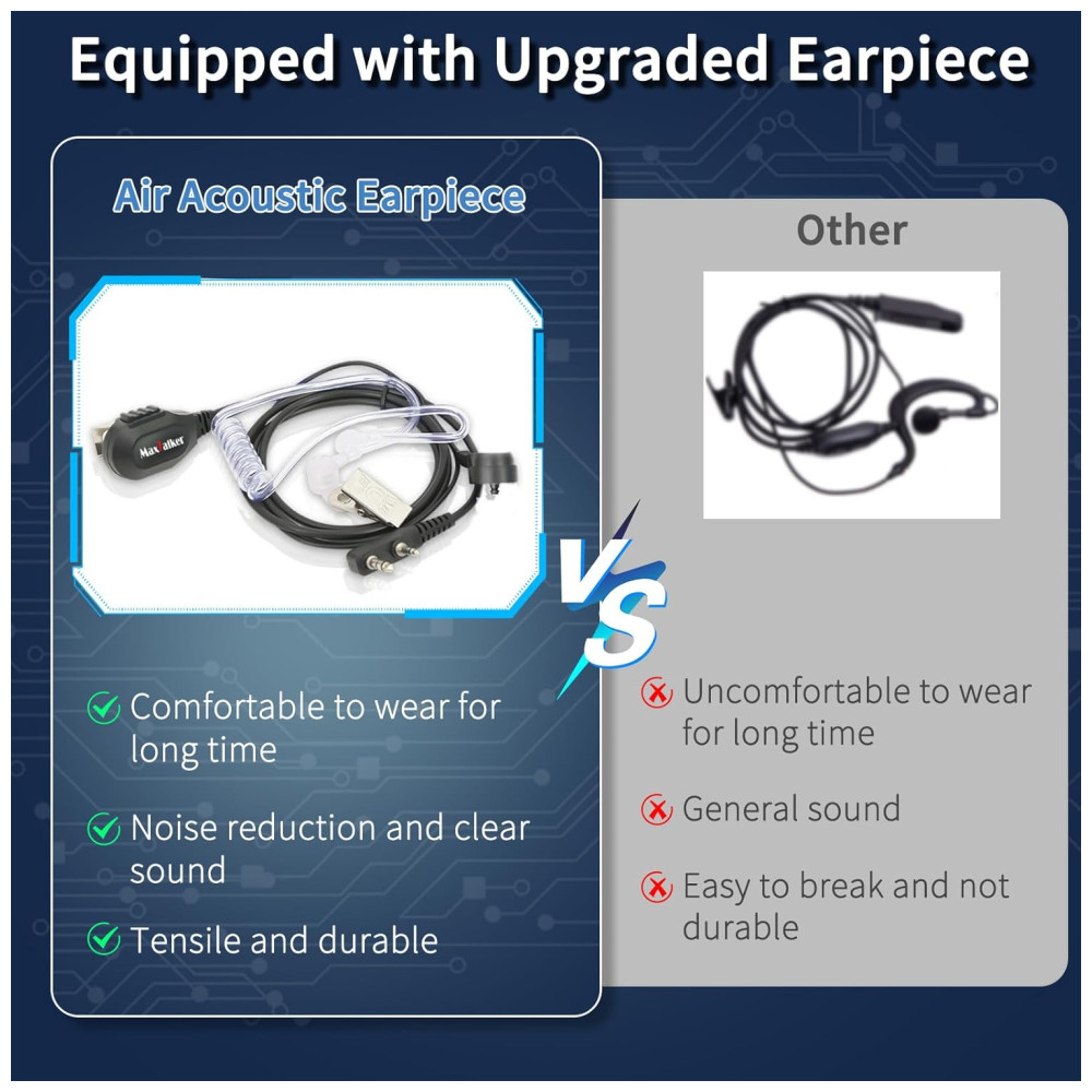 Os walkie talkies MaxTalker para adultos são projetados com chip independente que oferece sinal estável e podem atingir cerca de 4 milhas em áreas abertas onde não há obstáculos. Além disso, o fone de ouvido atualizado é projetado com tubo acústico de ar e fones de ouvido intra auriculares de silicone, garantindo que suas chamadas sejam cristalinas em ambientes barulhentos e mais confortáveis de usar.