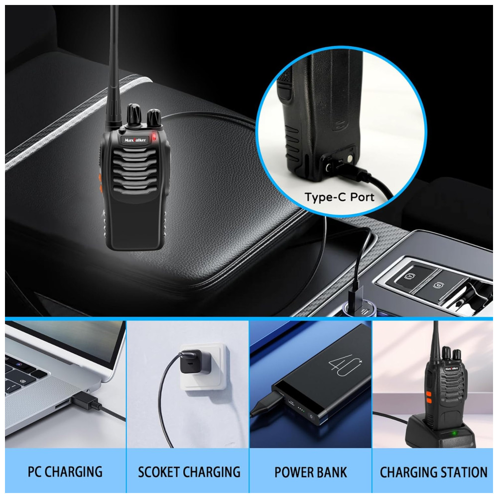 Os rádios portáteis contam com 16 canais, VOX, redução de ruído de 09 níveis, bloqueio de canal ocupado, alerta de bateria fraca, entre outras funcionalidades. Cada walkie talkie possui uma bateria recarregável durável de íons de lítio com capacidade de 1500 mAh e design com porta Tipo C, permitindo que seja facilmente recarregado através de um banco de energia, computador, carro, tomada de parede ou laptop. O tempo de uso sustentável da bateria com uma carga completa é de cerca de 812 horas, dependendo da frequência de uso dos walkie talkies de longo alcance.