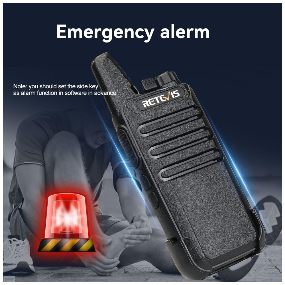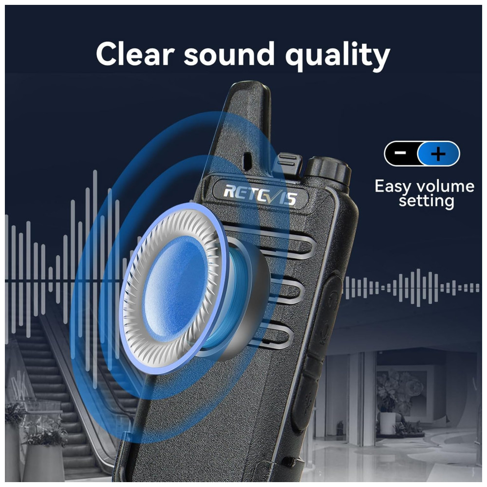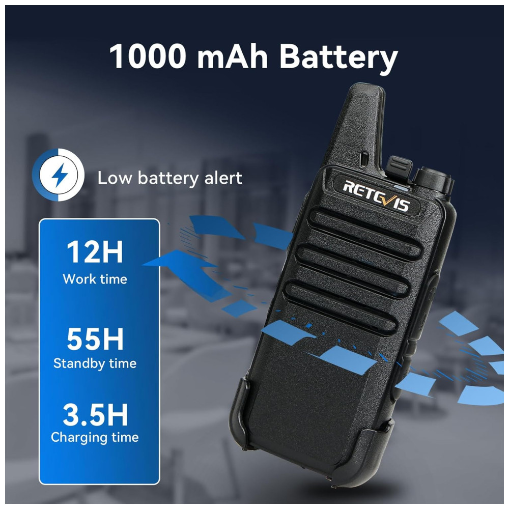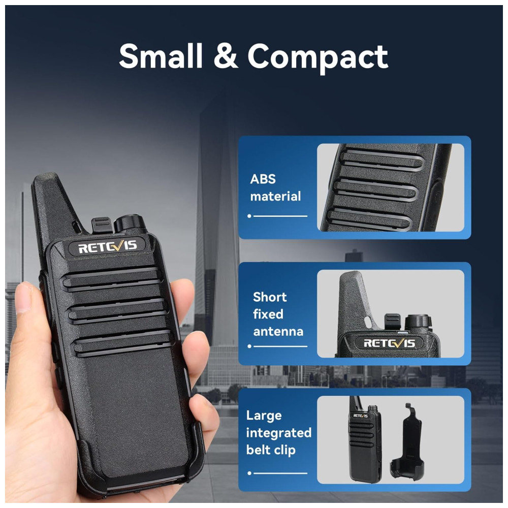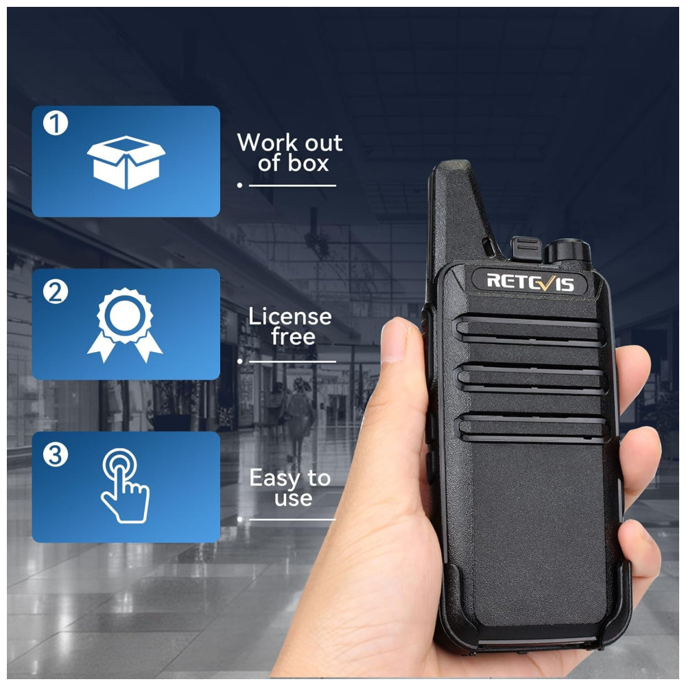 Este rádio bidirecional é perfeito para empresas, escolas, clubes de lazer, canteiros de obras em movimento e hospitais. Com recursos fáceis de usar, este walkie talkie simples e do tamanho da palma da mão permite que as empresas se comuniquem de forma eficiente. O VOX garante operação com as mãos livres, transmitindo o sinal automaticamente sem precisar pressionar nenhum botão. O microfone embutido permite que o usuário se comunique e ouça bem o outro rádio com áudio nítido. Além disso, o silenciador de 9 níveis de sensibilidade do VOX ajuda a desligar automaticamente as transmissões fracas ou ruídos indesejados devido a restrições de terreno ou alcance. Este walkie talkie funciona imediatamente após a instalação e a bateria de longa duração leva de 3 a 4 horas para carregar totalmente. As baterias suportam o uso o dia todo quando totalmente carregadas. Observe que nossos walkie talkies FCC ID é 2AAR8RT22 e atendem à regra FCC parte 95.