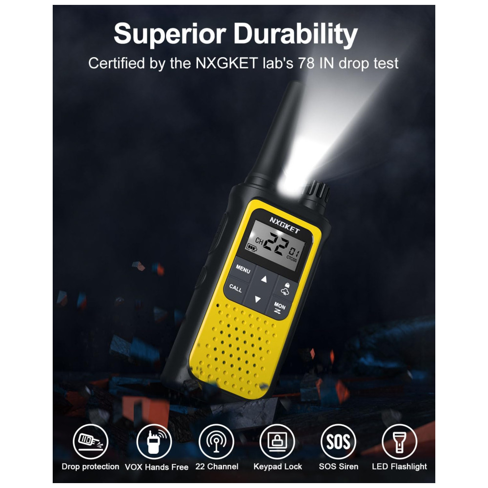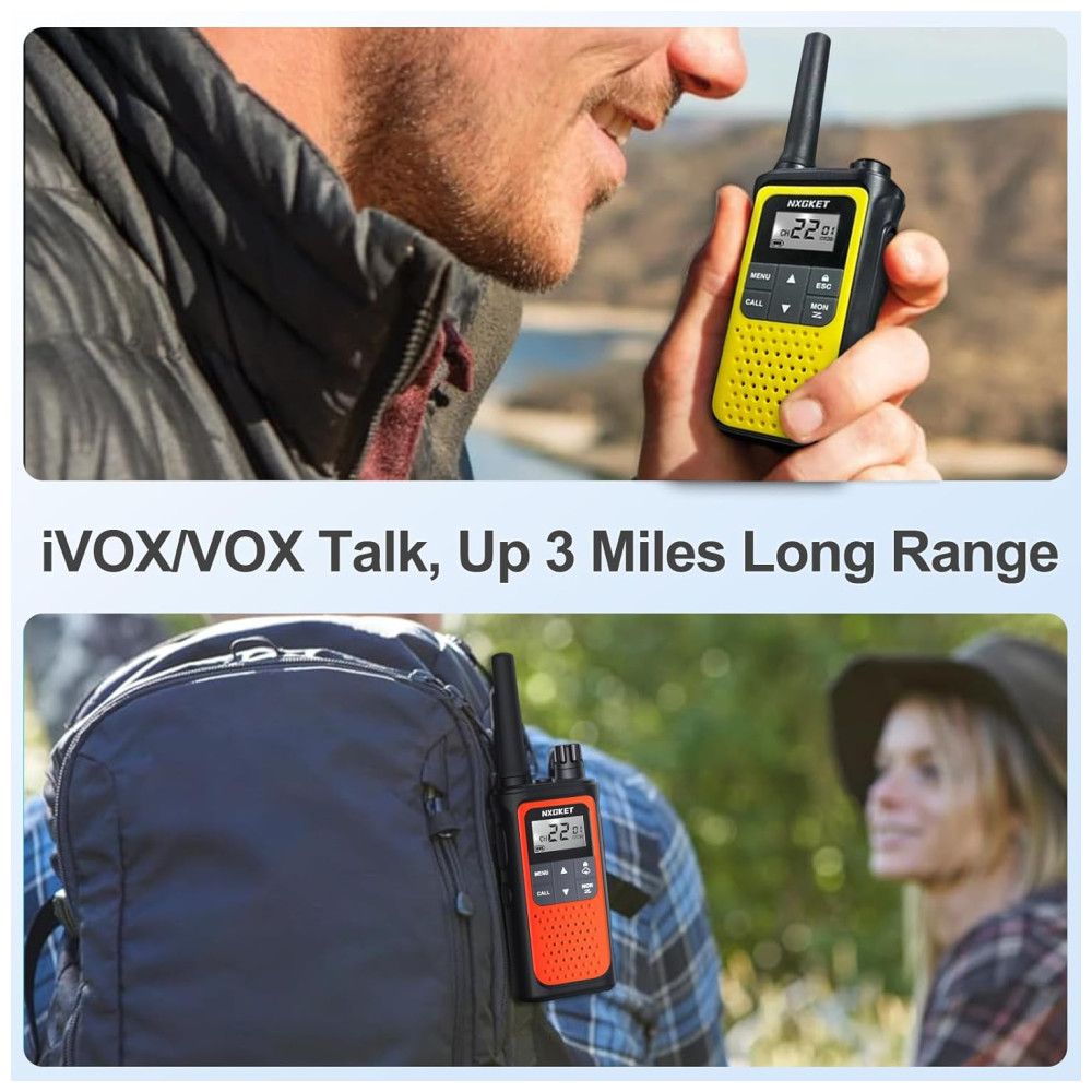 Fáceis de usar, os walkie talkies NXGKET possuem acabamento em cores brilhantes que ajuda na visibilidade, tela LCD grande e suportam muitos recursos avançados, como ajuste de volume, iVOX ativado por voz, silenciador automático, memória automática, varredura automática, alerta de bateria fraca, bloqueio de teclado, bloqueio de canal, potência ajustável, proteção contra quedas, lanterna embutida, entre outros.
