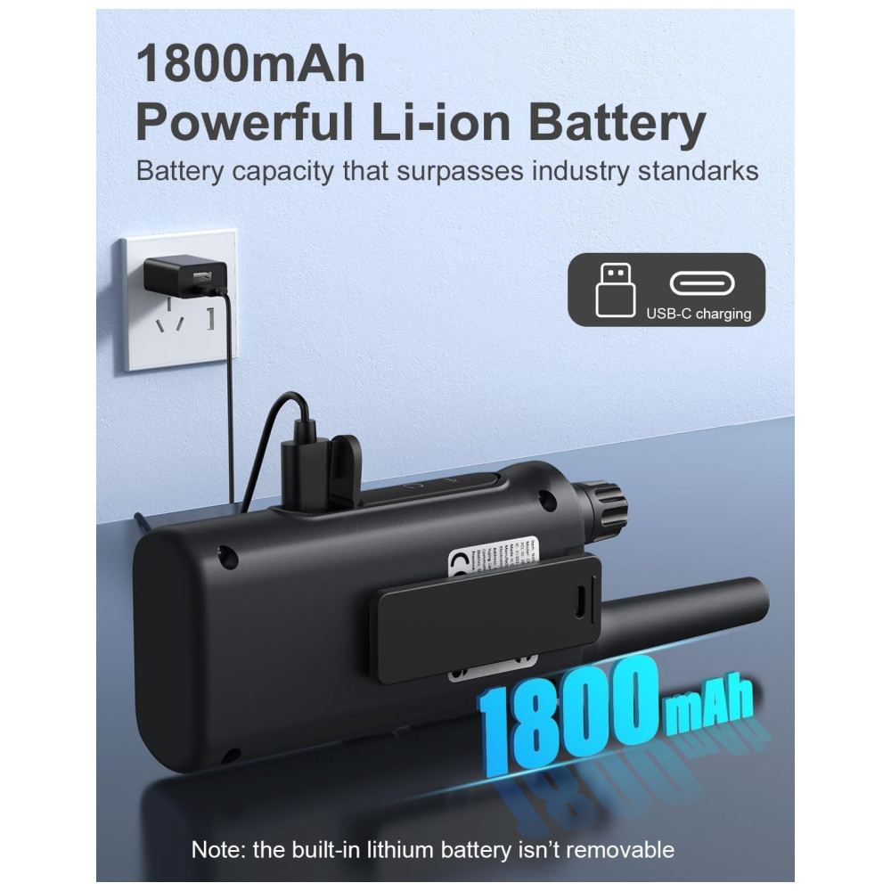 O pacote inclui 4 baterias de lítio de 1800 mAh recarregáveis, o que torna os walkie talkies mais econômicos e ecológicos. Não é necessário instalar a bateria e você não precisa comprar e descartar as baterias repetidamente como outros walkie talkies. Os walkie talkies podem ser carregados com o cabo USBC 21 e vêm com tudo o que você precisa, incluindo carregadores.