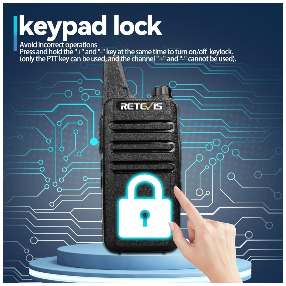 Este é um rádio bidirecional sem licença FRS, extremamente compacto e fino, ideal para uso comercial. Ele possui 16 canais e funciona imediatamente, sem a necessidade de uma licença para operar. O pacote inclui um carregador multi gang de seis vias com múltiplas proteções de carregamento, como proteção contra sobrecarga, sobretensão e curto circuito, tornando o mais seguro para carregar os 6 rádios bidirecionais ao mesmo tempo. O rádio cabe na palma da sua mão, sendo fácil de transportar e simples de operar, economizando espaço. Seu comprimento de antena é de 17,78 cm e seu peso é de 108g. Ele possui um bloqueio de tecla para salvar as configurações atuais, reduzindo a insegurança no trabalho causada por operações frequentes e erros causados por tocar acidentalmente em outros botões quando ocupado. Sua maior durabilidade é garantida pelo material ABS antiqueda e pelo clipe traseiro grande integrado, que aumenta a estabilidade. A antena curta fixa reduz danos causados por quedas. O rádio também conta com um alarme de emergência para ajudá-lo a estar preparado para qualquer perigo e alertar os membros da equipe. A função de transmissão ativada por voz de nível 09 permite operação com as mãos livres reais, ajustando o nível de acordo com o ambiente, permitindo que você obtenha a melhor qualidade de áudio. É importante observar que os walkie talkies possuem o ID da FCC 2AAR8RT22 e atendem à Regra da FCC parte 95.