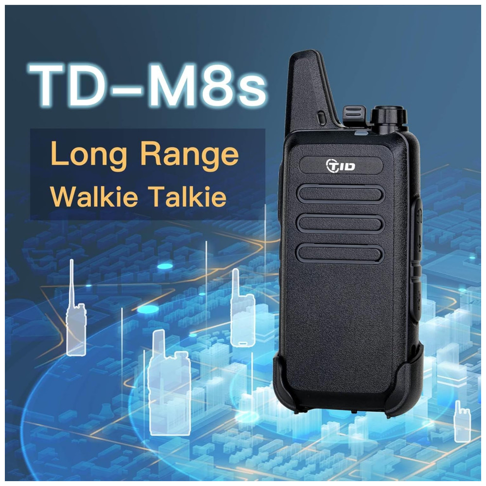Os walkie talkies TDM8s são ideais para comunicação em áreas abertas, como áreas rurais, subúrbios ou litoral, podendo atingir até 4,83 km de alcance. Em cidades ou vilas, o alcance pode variar dependendo do ambiente. Possuem uma bateria com capacidade superior a 1000mAh, permitindo um uso prolongado. Contam com funções como controle de voz VOX, varredura de canais e seleção de canal programável. O alto falante embutido proporciona som alto e cristalino para comunicação eficiente. São portáteis, com peso leve e tamanho de palma, e possuem tubo acústico confortável para uso prolongado. A casca é resistente a quedas e à prova de chuva.