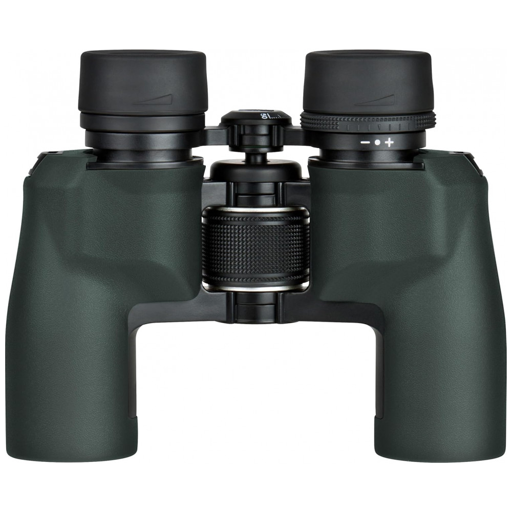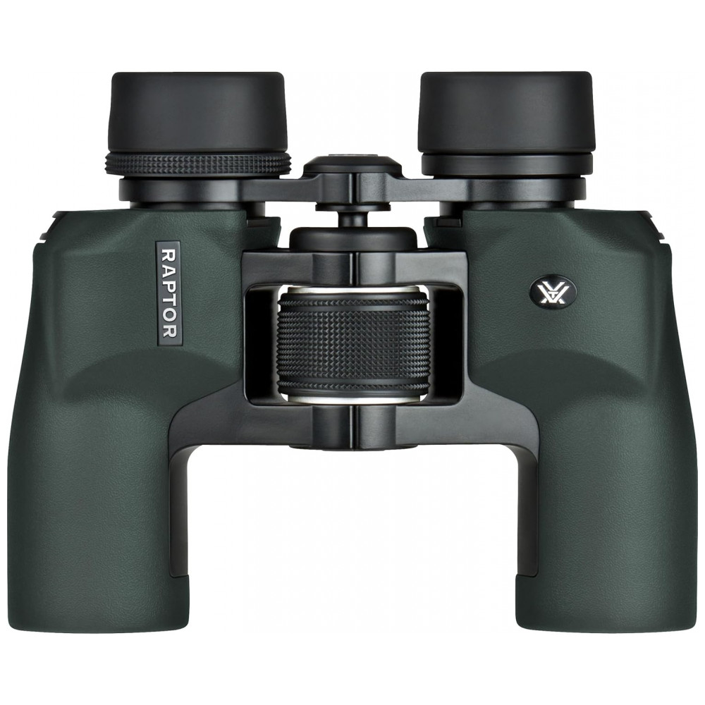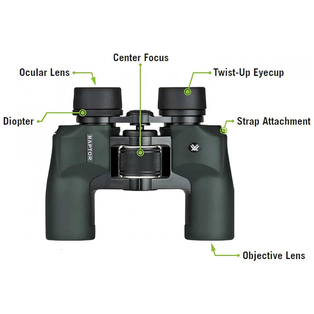 Ampliação de 8,5x e lentes objetivas de , este binóculo Raptor possui um design de prisma porro grande angular que se flexiona para promover uma visualização confortável para uma variedade de estruturas faciais, amplas ou estreitas.