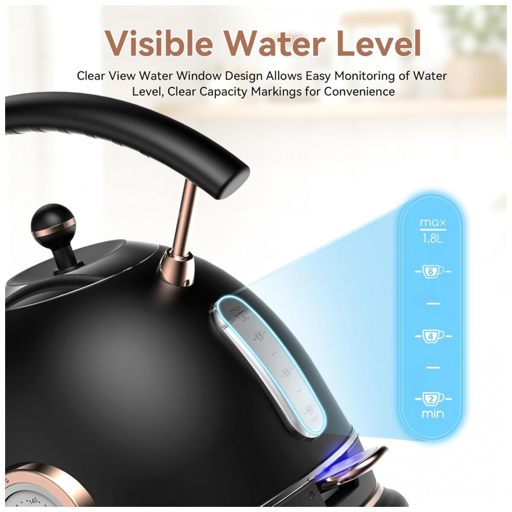 A chaleira elétrica retrô da Rasonic combina elegância e funcionalidade com seu design atemporal nas cores preto fosco e rosa dourado, transformando sua cozinha num ambiente sofisticado. Com potência de 1500W, ela garante uma fervura rápida e silenciosa, ideal para preparar chá, café ou água quente sem barulhos incômodos, perfeita para uso doméstico ou no escritório. Construída em aço inoxidável de alta qualidade tanto no interior quanto no exterior, oferece resistência à ferrugem e desgaste, garantindo sempre água quente pura e livre de contaminantes. Com capacidade de 1,8 litros, esta chaleira elétrica é robusta e confiável para uso diário. Seu termostato Strix inteligente assegura o desligamento automático após a fervura, economizando energia e prolongando a vida útil do aparelho em até 30%, além de contar com proteção contra funcionamento a seco, aumentando a segurança e evitando acidentes. A chaleira possui uma janela transparente com indicador de nível de água e termômetro integrado, facilitando o acompanhamento do processo de aquecimento para preparos precisos de chás, refeições instantâneas ou cafés. O design sem fio com base giratória de 360° permite manuseio e serviço confortáveis de qualquer ângulo, enquanto o filtro embutido retém impurezas, garantindo água mais limpa. Compacta, combina praticidade e estilo para seu dia a dia na cozinha. Produto projetado para oferecer alta performance com facilidade de manutenção e cuidado.