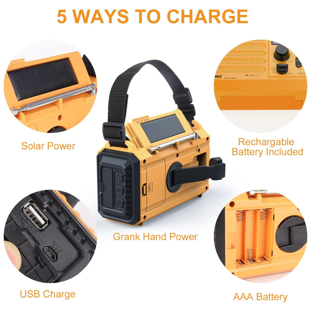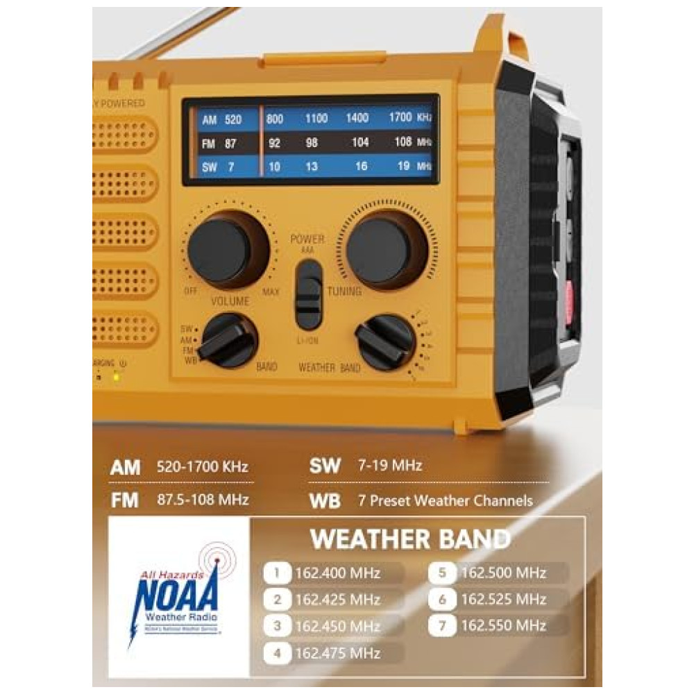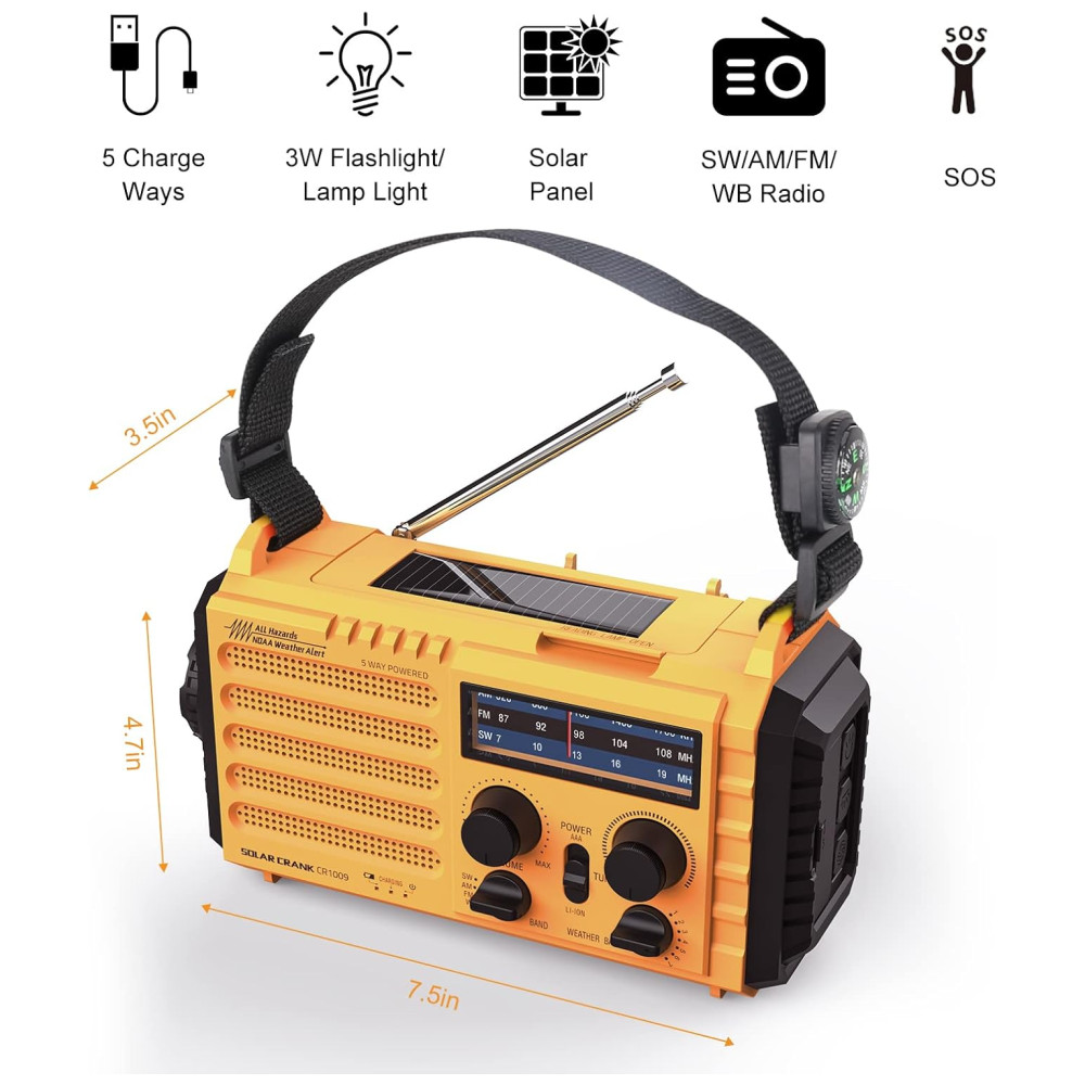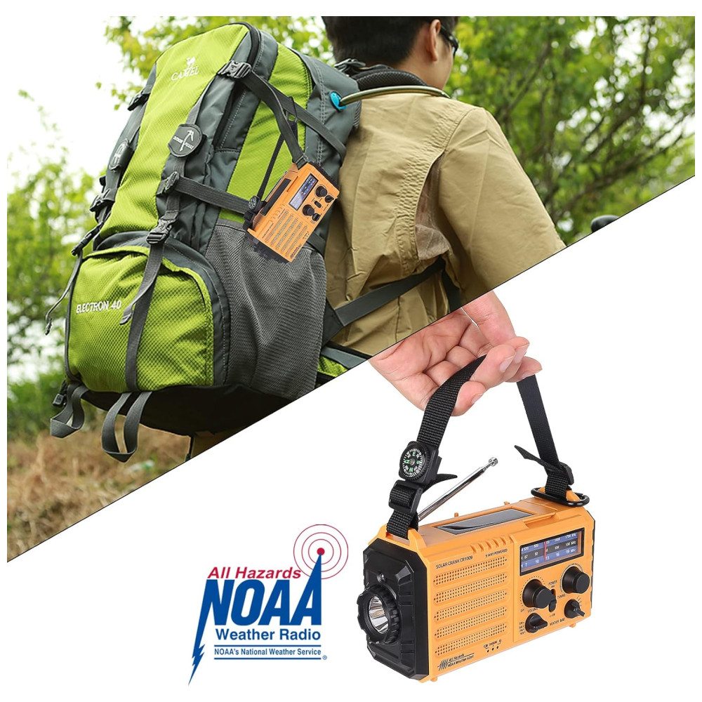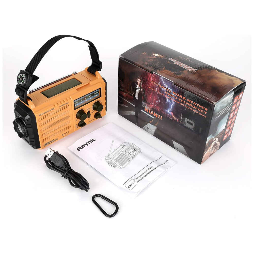 FONTES DE ENERGIA DE 5 VIAS. Os rádios meteorológicos com várias opções de backup de energia são a melhor escolha. É mais fácil manter o rádio funcionando durante uma situação prolongada em que a energia CA está desligada e as pilhas foram gastas. Os rádios de manivela com o banco de potência de 2000mAh são suficientes para carregar o seu telefone celular ou dispositivos USB para uma breve ligação ou uma mensagem de texto durante a emergência. Este rádio meteorológico com lanternas integradas de 3W e lâmpada de leitura de 2,5W é útil durante cortes de energia de emergência para ver qualquer sinal no escuro. pode ser um salva vidas durante desastres perigosos, como tornados e furacões. Faz sentido escolher um rádio meteorológico multiuso, durável e fácil de usar nessa situação. Este rádio de alerta meteorológico NOAA é projetado especialmente para necessidades de emergência. Ele alertará automaticamente se algum aviso de emergência for emitido. Possui sintonia analógica padrão dos canais climáticos AM , FM , SW , 7 NOAA. É um dispositivo específico projetado para receber avisos de emergência para vários eventos climáticos com risco de vida, como ciclones, furacões, tsunamis e outros desastres climáticos. RÁDIO PORTÁTIL E BÚSSOLA. Este rádio portátil de emergência portátil é surpreendentemente pequeno e leve. Sua dimensão é x x e peso 550 gramas, e ele vem com a função de alarme SOS e uma bússola necessária. Para fins de caminhada ou trekking, esse tipo de rádio é uma escolha inteligente. Transportar uma unidade grande é bastante difícil quando você precisa se movimentar durante emergências. Embalagem incluída 1 Rádio meteorológico de emergência Raynic com bateria de íon de lítio embutida, 1 cinto de trança útil, 1 mosquetão, 1 bússola e 1 manual do usuário