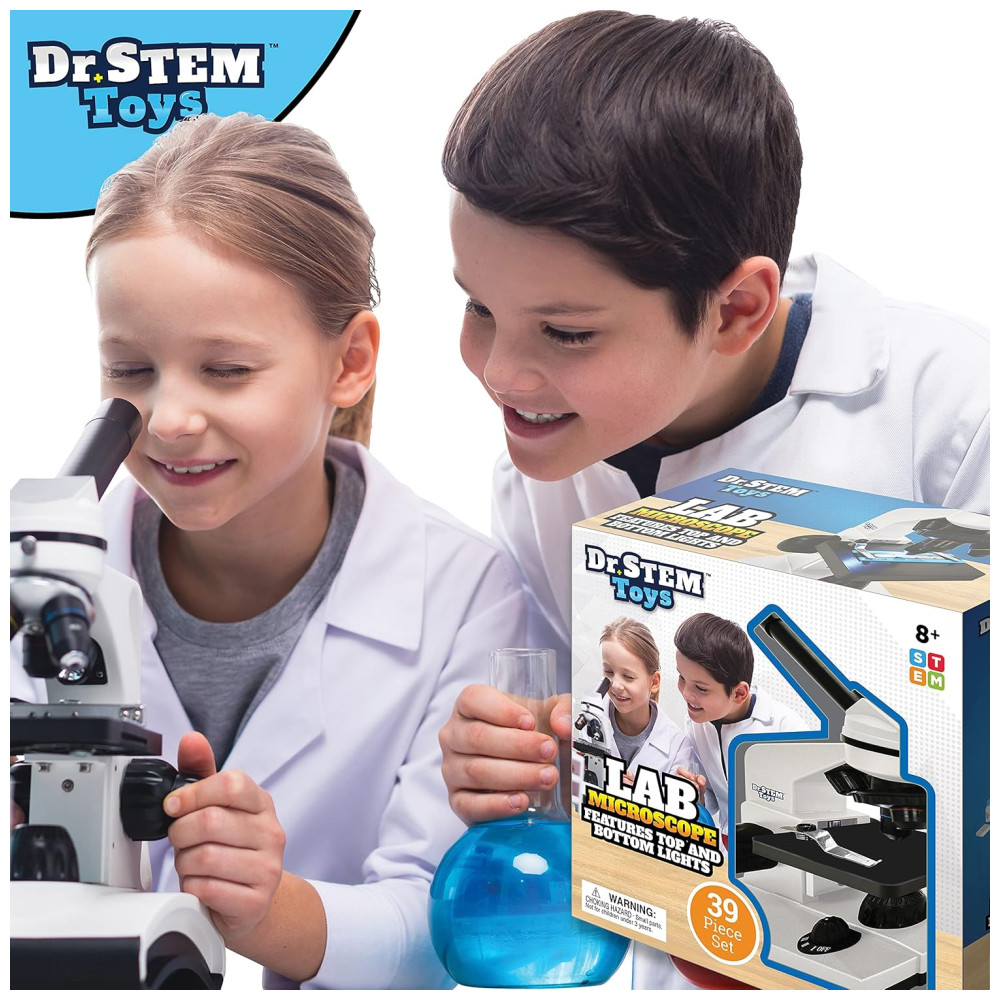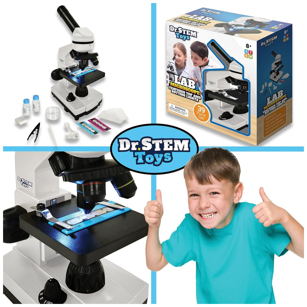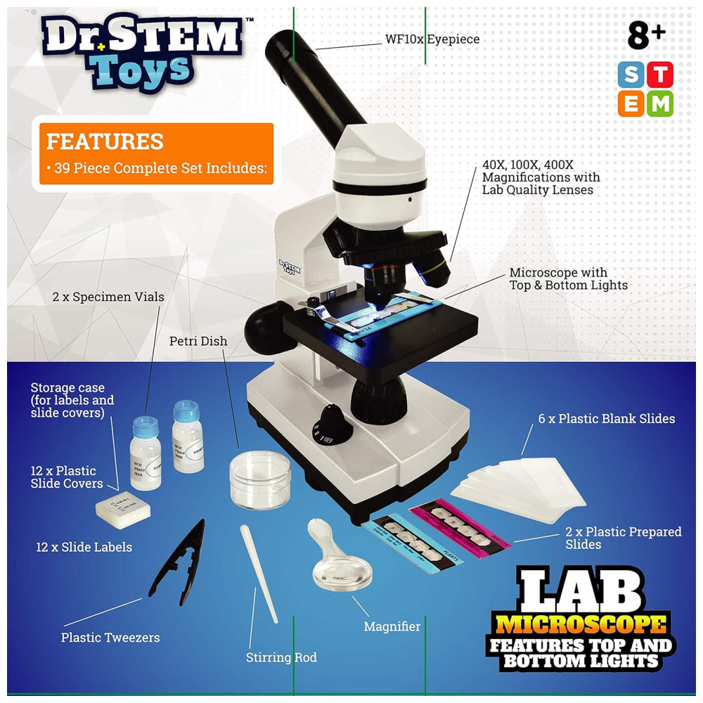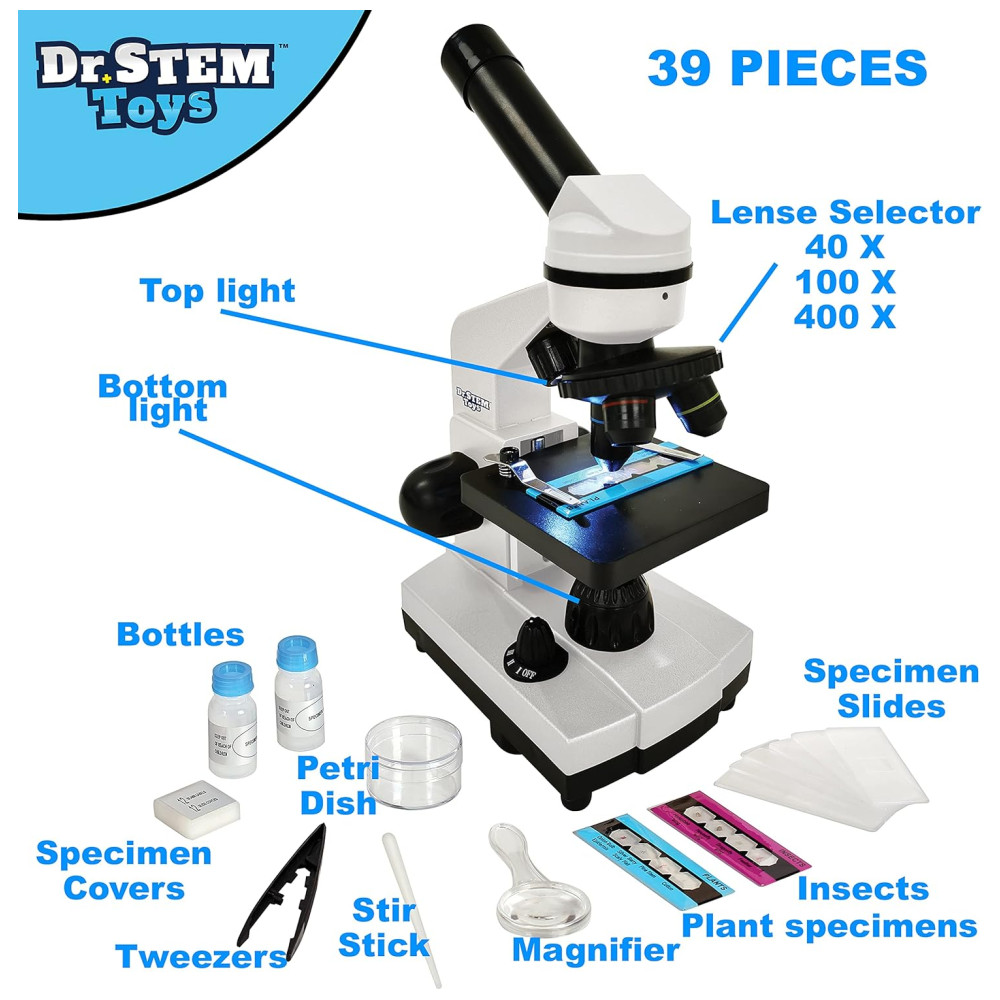 CONJUNTO COMPLETO DE 39 PEÇAS Inclui microscópio de luz dupla, garrafas, tampas de lâminas, vareta de mexer, placa de Petri