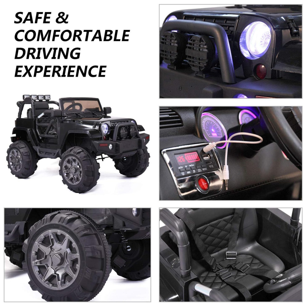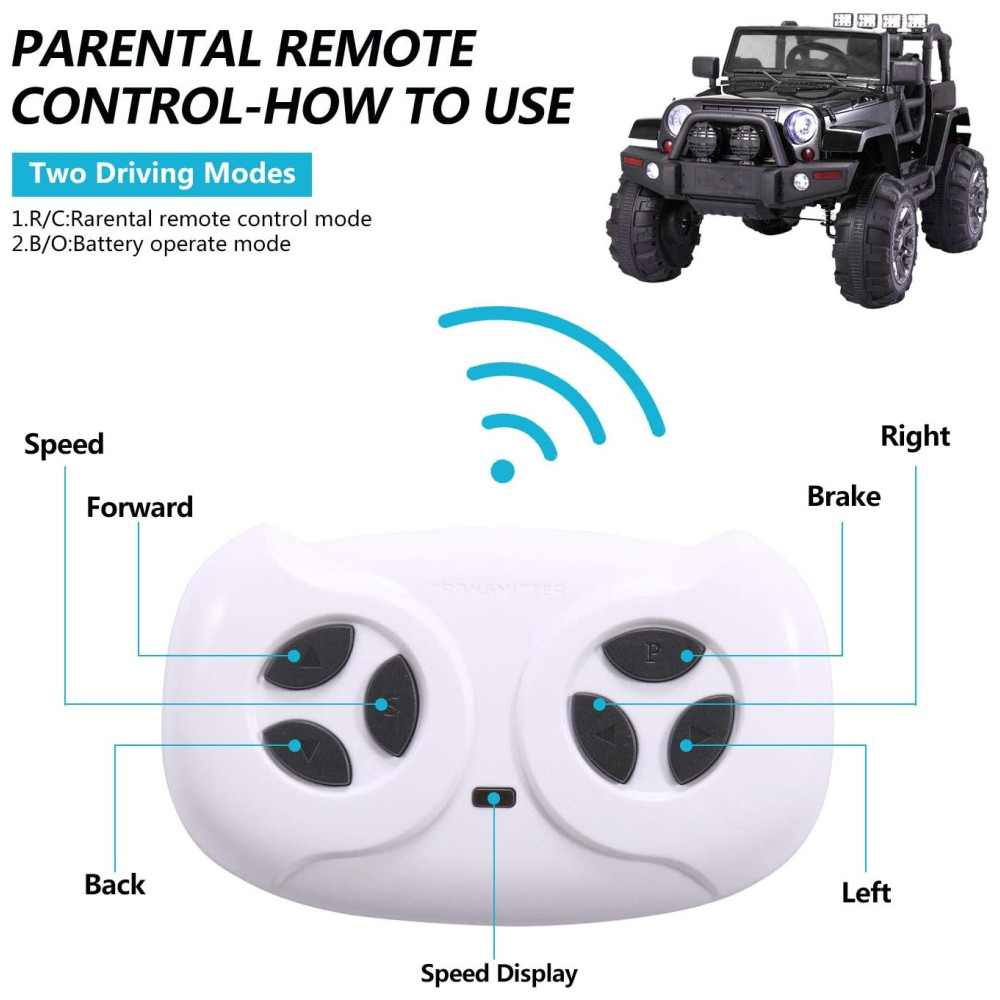 Garantia de segurança as rodas dianteiras e traseiras são equipadas com sistema de suspensão de mola para garantir uma viagem suave e confortável, ideal para pneus lisos e ásperos. Controle remoto parental, cinto de segurança ajustável e porta dupla com fechadura magnética oferecem segurança máxima para seus filhos. Além disso, a função de início suave evita que as crianças se assustem com uma aceleração ou travagem repentina.