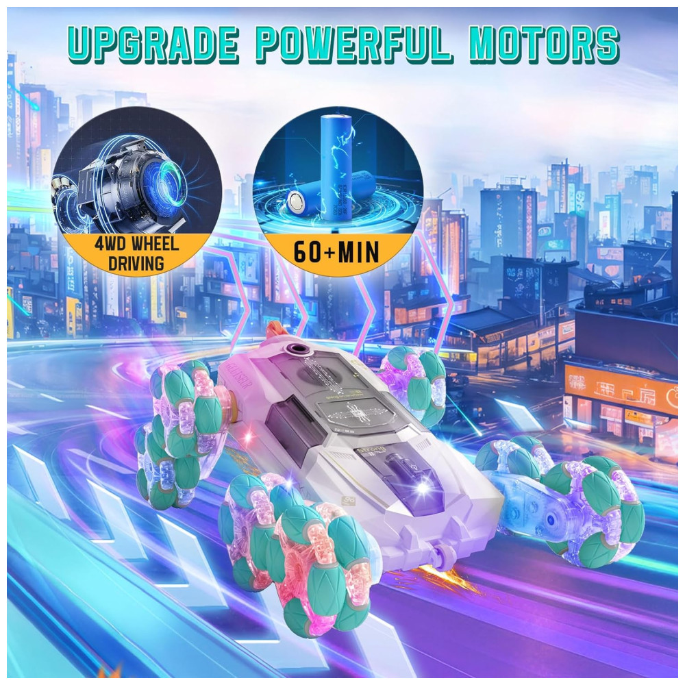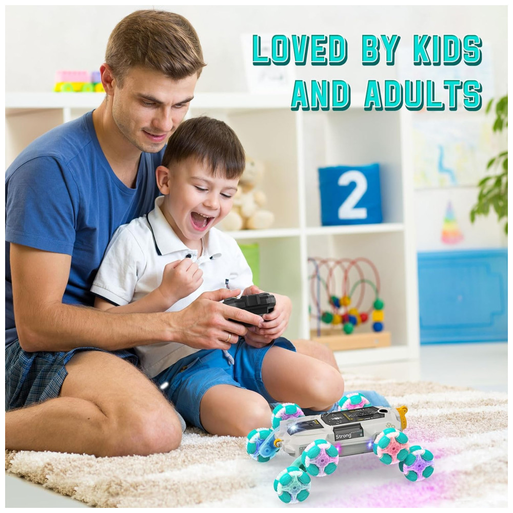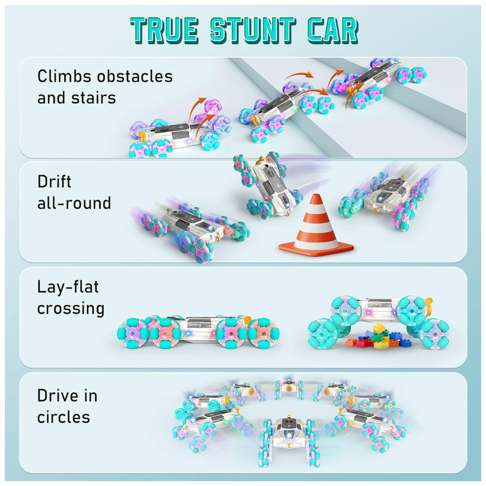 Apresentamos o mais recente Carrinho de Acrobacias de 8 Rodas SAUFTTI, que vai além dos movimentos tradicionais. Além de avançar, retroceder, virar à esquerda e à direita, ele faz rotação 360 graus, derrapa, rasteja e pode se mover dos dois lados. Cada par de braços das rodas pode operar de forma independente, girando em direções diferentes para desviar de obstáculos. Com luzes coloridas, jatos de escape e efeitos sonoros realistas, proporciona uma experiência de direção envolvente. Equipado com dois modos de controle remoto: tradicional e por gestos. Com duas baterias recarregáveis para horas de diversão. Um presente incrível e moderno para crianças de 6 a 12 anos, ideal para datas comemorativas.