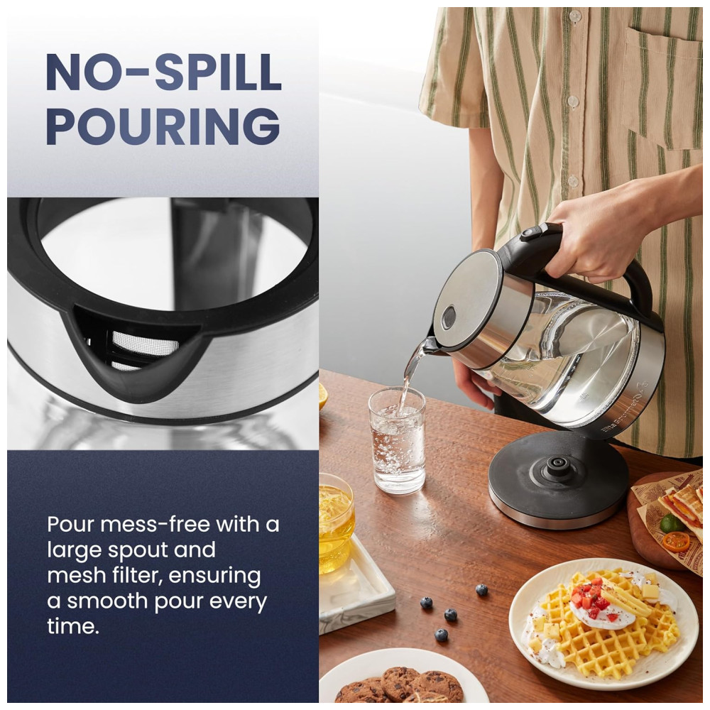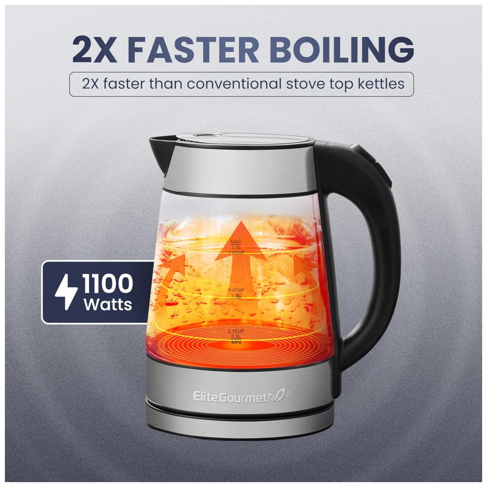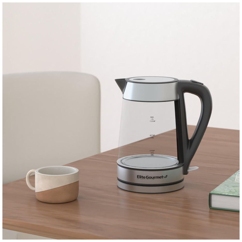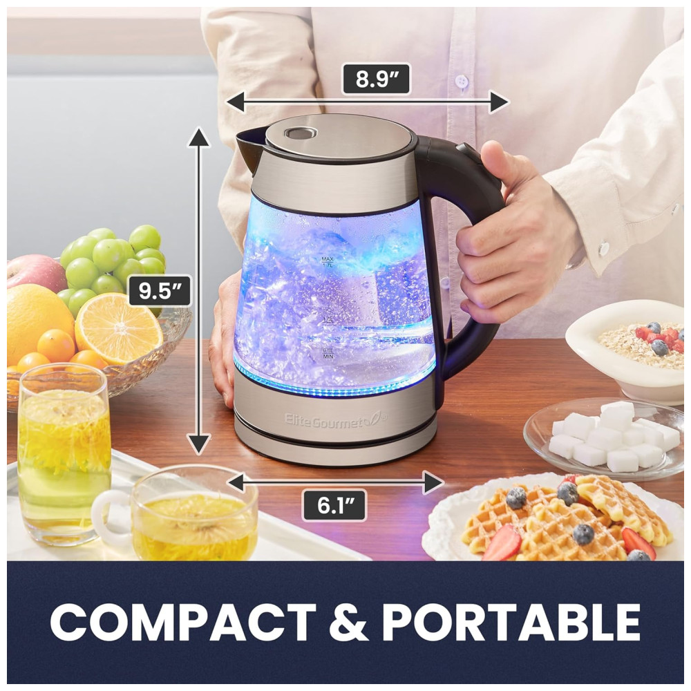 A Chaleira Elétrica de Vidro sem Fio Elite Gourmet é o equilíbrio perfeito entre elegância e funcionalidade. Além de ser uma bela adição a qualquer cozinha, essa chaleira ferve água de forma eficiente, economizando tempo e energia em comparação com as chaleiras convencionais de fogão. Agora você não precisa esperar muito tempo para saborear uma xícara de chá! Com capacidade de 1,7 litros, design premium em aço inoxidável e vidro com interior azul iluminado, a chaleira elétrica Elite Platinum traz praticidade e luxo moderno para sua bancada. Com bico de despejo amplo e filtro de malha para despejos perfeitos, evitando derramamentos. Além disso, a função de desligamento automático garante segurança e conveniência, desligando a chaleira assim que a água ferve. Apenas configure e esqueça! Compatível com ETL, possui 1250-1500 watts de potência para aquecimento rápido. Aproveite seu chá aromático, café ou cacau quente favorito a qualquer momento!