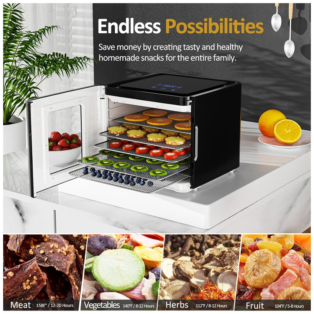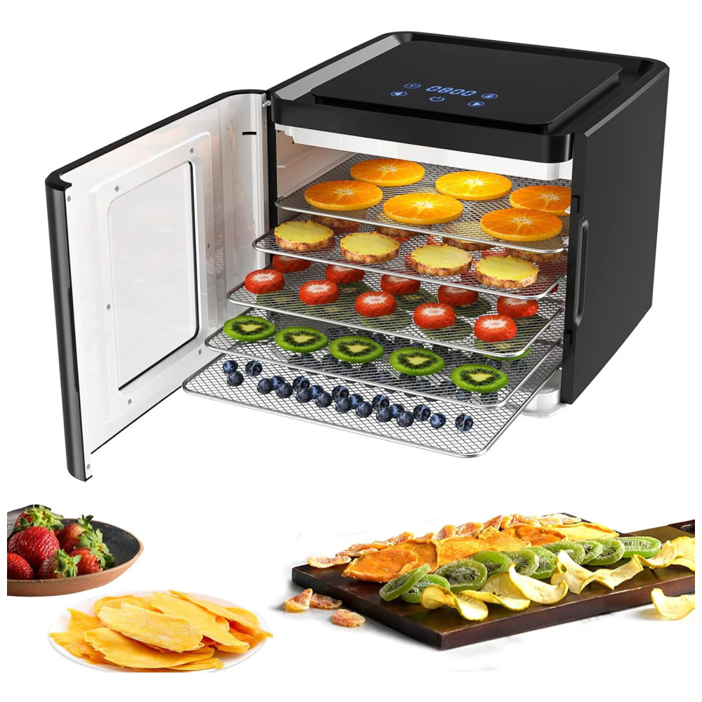A máquina desidratadora de alimentos tem mais espaço de zenamento e display digital LED, controle preciso de temperatura e configurações de tempo, fácil e conveniente de usar 6 bandejas de aço inoxidável e uma bandeja coletora são feitas de materiais de alta qualidade. É uma escolha ideal como uma vida verde.