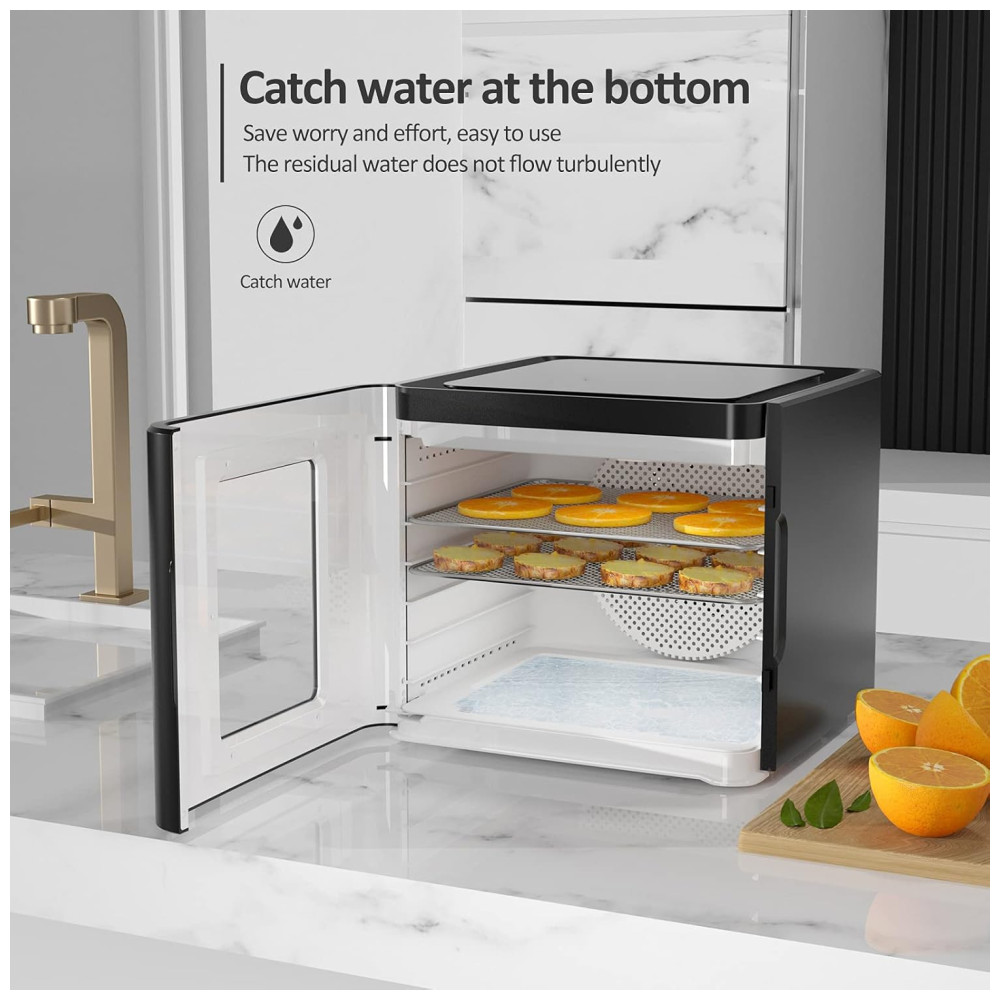 ventilador instalado na parte traseira do desidratador facilita a circulação de ar e se comunica com a circulação de ar quente 360 no grande espaço interno da caixa para promover a secagem uniforme dos alimentos. Através da tampa transparente da porta, a secura dos alimentos pode ser monitorada em tempo real, o que economiza tempo e é fácil e conveniente