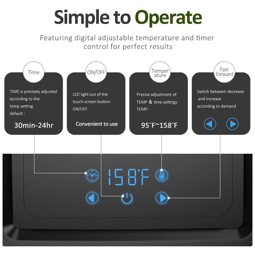 Temperatura selecionada do painel de toque de luz LED 95 158 tempo de trabalho 0 24 horas. Defina um controle preciso de temperatura e tempo para atender às necessidades de secagem de diferentes alimentos, manter a textura e obter o melhor sabor. Quando a temperatura atinge a temperatura definida, a proteção contra superaquecimento será ativada após terminar, o cronômetro desligará automaticamente. É usar.